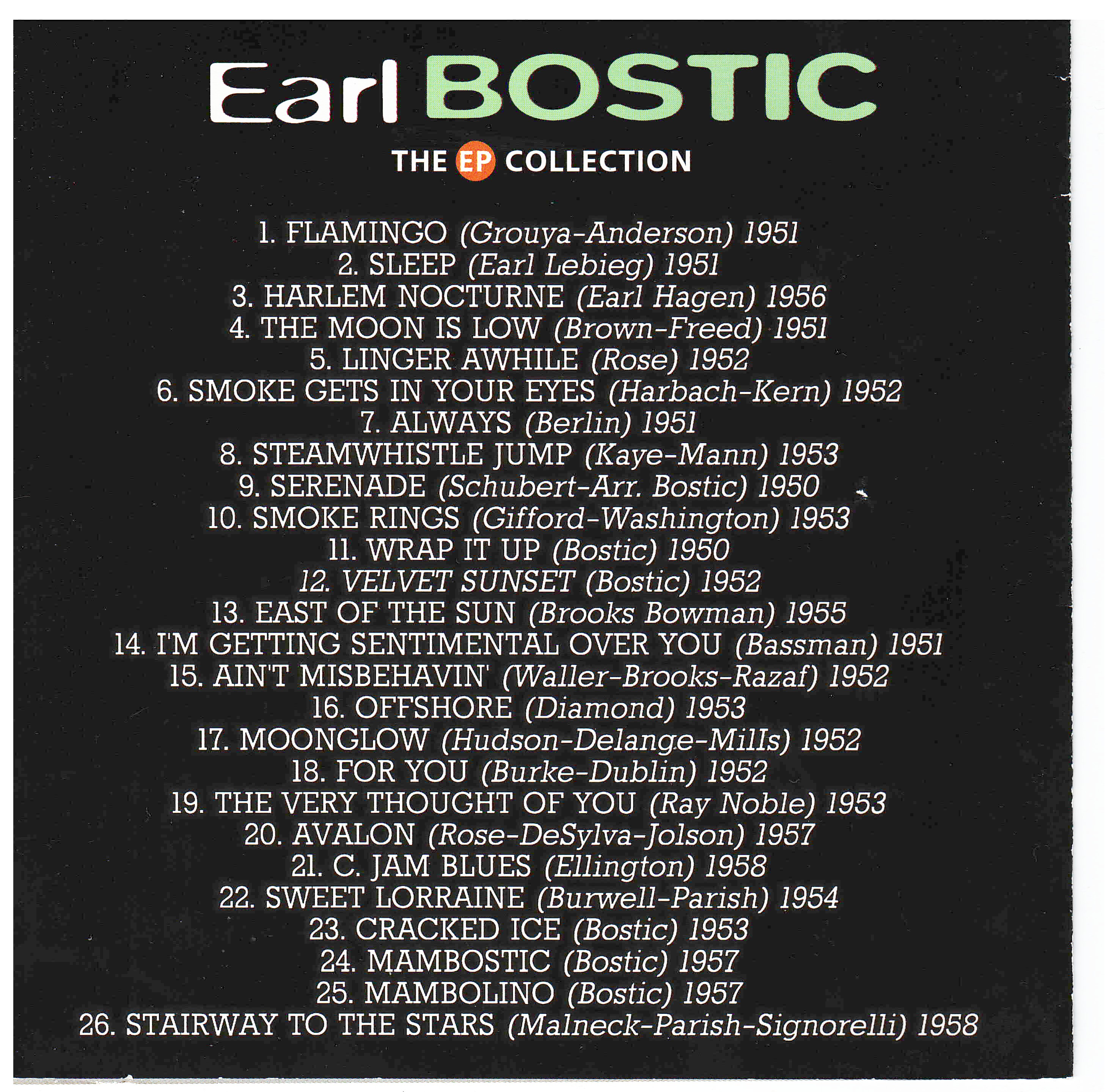 Earl Bostic родился 25 апреля 1913 года, в Талса (штат Оклахома). Эрл Бостик – один из интереснейших ритм-н-блюзовых исполнителей середины XX века, имевший на своём счету десятки хитов высшего достоинства. Наряду с Louis Jordan и Johnny Ray он был предтечей рок-н-ролла, и, чтобы в этом убедиться, достаточно прослушать наиболее "быстрые" вещи. Знаменитый барабанщик Арт Блейки как-то сказал: "Никто не знает больше о саксофоне, чем Бостик, – я говорю в чисто техническом смысле – и в том числе, Птица (имелся в виду общепризнанный гений саксофона Чарли Паркер)", а молодой Джон Колтрейн состоял в группе Бостика и многому научился у этого виртуоза.
