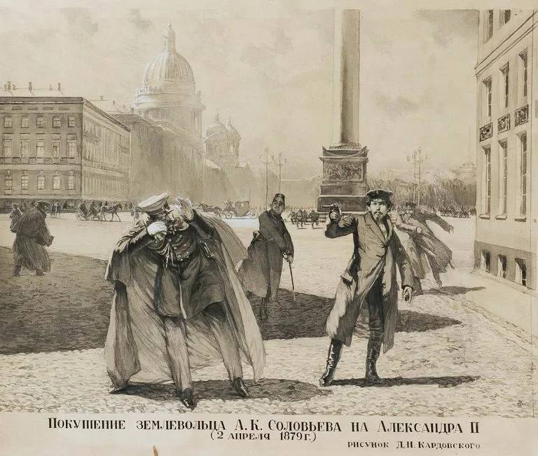 Террорист Александр Константинович Соловьёв совершил неудачное покушение на императора Александра II, который совершал свою обычную утреннюю прогулку в окрестностях Зимнего дворца без охраны и без спутников. Все выстрелы прошли мимо предполагаемой цели. При попытке задержания Соловьёв принял яд (мышьяк, или, согласно тексту обвинительного акта, – цианистый калий). Проглоченный Соловьёвым цианистый калий не привел к смерти, которая должна была покрыть тайной его имя. Признаки отравления были тотчас замечены, и противоядие спасло жизнь для суда и смерти через повешение.