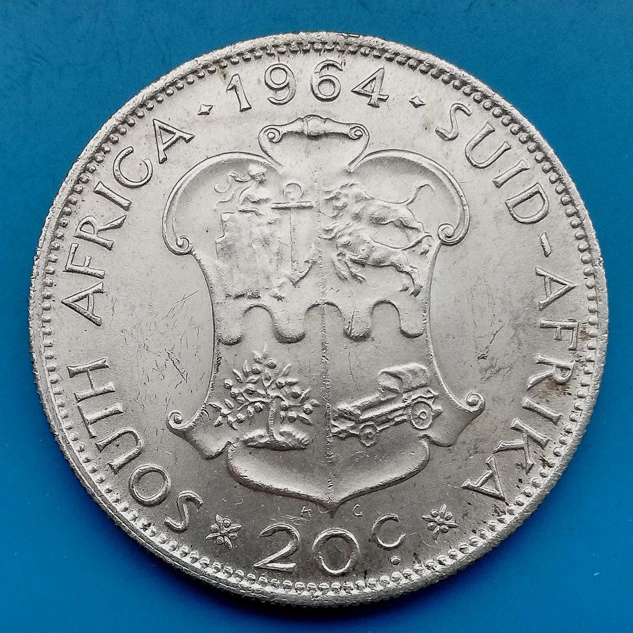 ЮАР, в нашем старорежимном восприятии, - это апартеид, бантустаны и изможденные негры на шахтах. Ну, возможно... не был не знаю. Зато там выпускались в оборот интересные монеты. Большие и серебряные - такие, как эти 20 центов 1964 года.