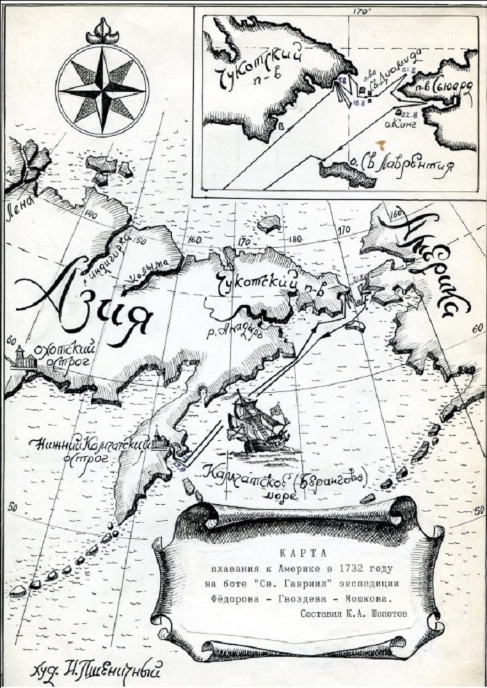 1732 - Из Нижнекамчатского острога вышел бот "Святой Гавриил" с экспедицией русских мореходов Михаила Гвоздева и Ивана Фёдорова к берегам Аляски – первая из российских экспедиций достигла северо-западного побережья Америки. Мореплаватели впервые нанесли на карту около 300 км побережья Аляски, берегов пролива и островов в нём.