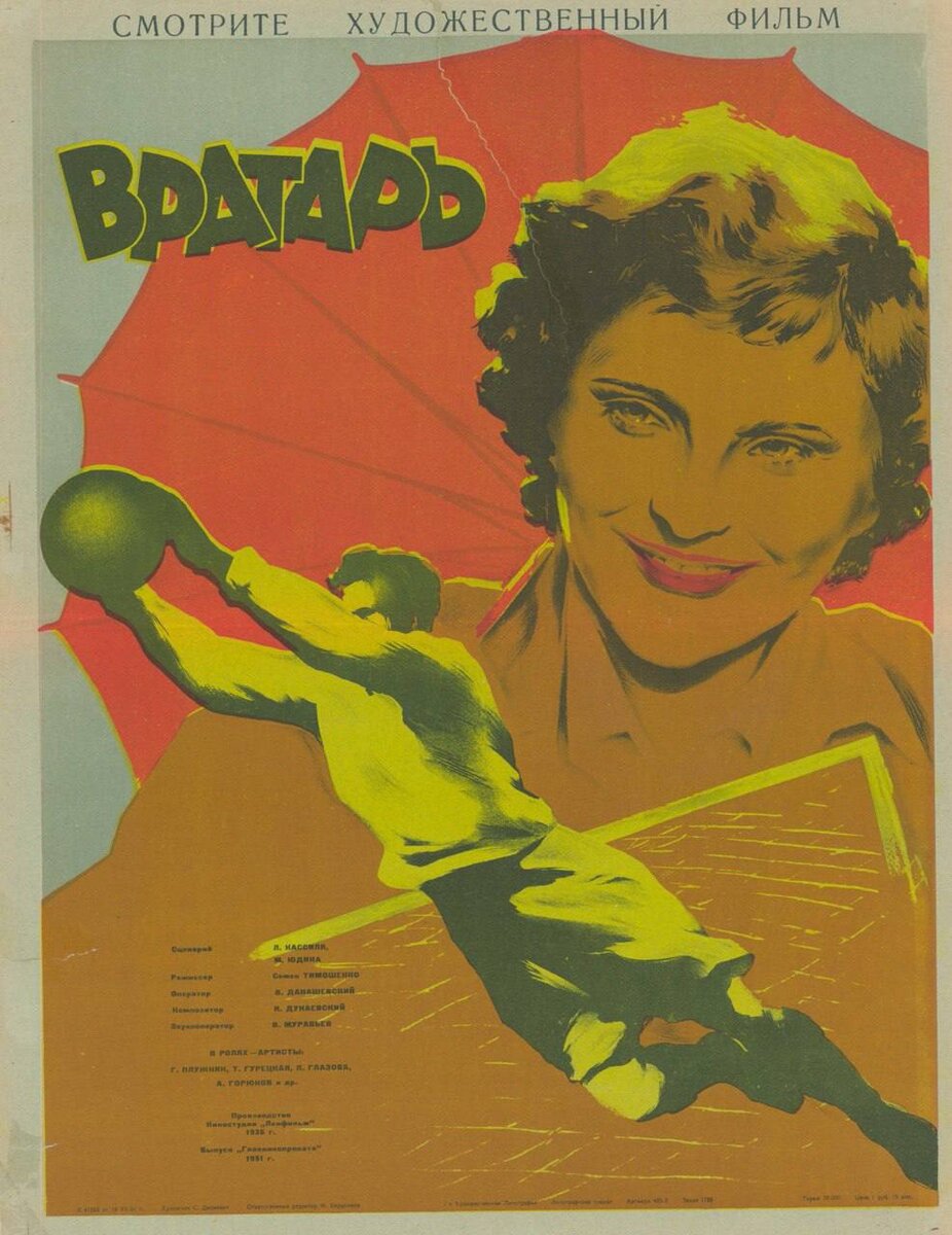 1936 - Состоялась премьера художественного фильма "Вратарь", снятого на киностудии Ленфильм, Мосфильм (восстановление). Режиссер: Семен Тимошенко. Композитор: Исаак Дунаевский. В фильме снимались: Григорий Плужник, Анатолий Горюнов, Татьяна Гурецкая, Людмила Глазова, Валерий Соловцов, Яков Гудкин, Владимир Крюгер, Г. Эразмус, Фёдор Курихин. Основан на романе Льва Кассиля "Вратарь республики".