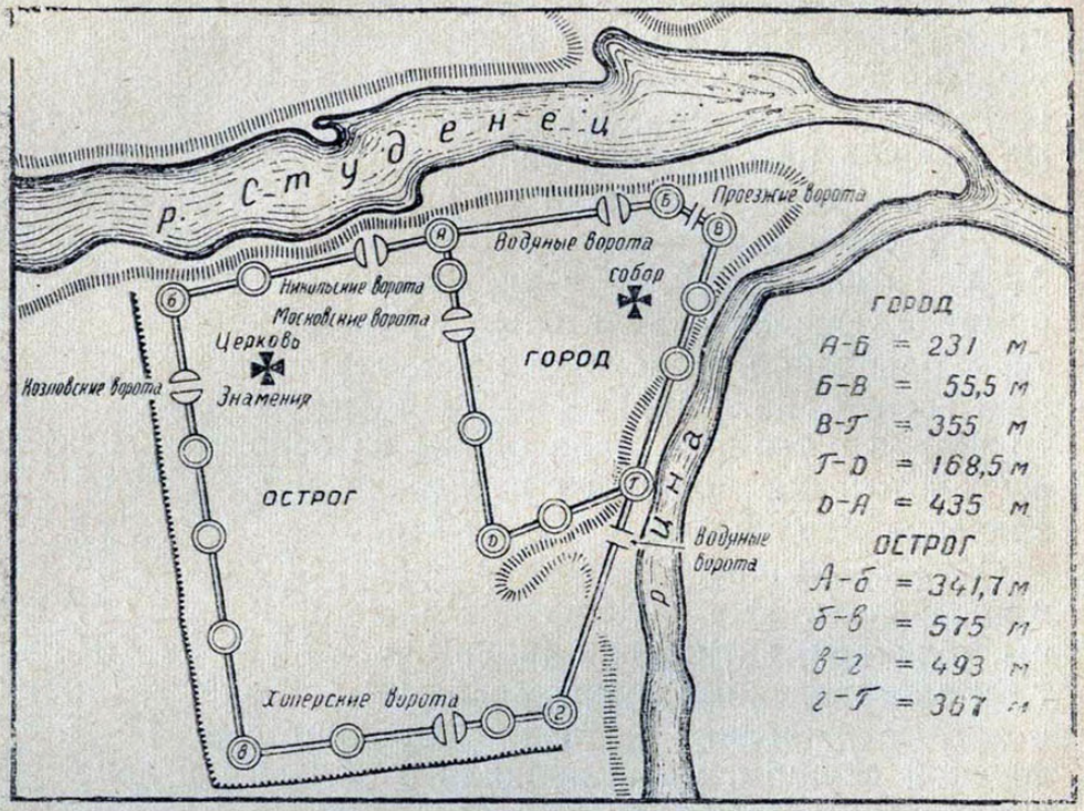 В октябре крепость Тамбов уже обрела законченный, весьма внушительный, облик. Крепость была условно разделена на 2 части: острог и кремль. Кремль составляла центральная часть города с высокими башнями. В этой зон располагалась съезжая изба, пороховой погреб, воеводский двор, 9 жниц для зерна, пушечный амбар, церковь и тюрьма. Характерным для этих построек было произвольное расположение. Прямые улицы для русского строительства не было принято.