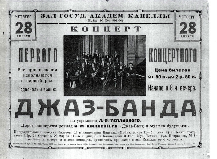 1927 - В зале Капеллы дебютировал "Первый концертный джаз-банд" Л.Я. Теплицкого, который он организовал после возвращения в СССР из профессиональных музыкантов.