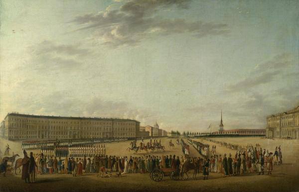 на фото: И.-Г. Майр. Развод караула на Дворцовой площади. Между 1796 и 1803 (?). (ГРМ, Михайловский замок).