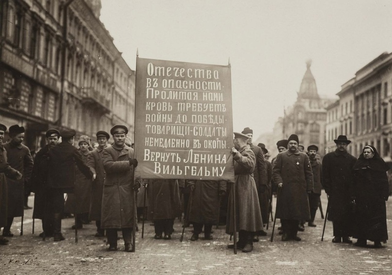 Участники несли транспаранты с лозунгами: "Пролитая нами кровь требует войны до победы!", "Отечество в опасности!", "Вернуть Ленина Вильгельму!", "Товарищи солдаты, немедленно в окопы!".