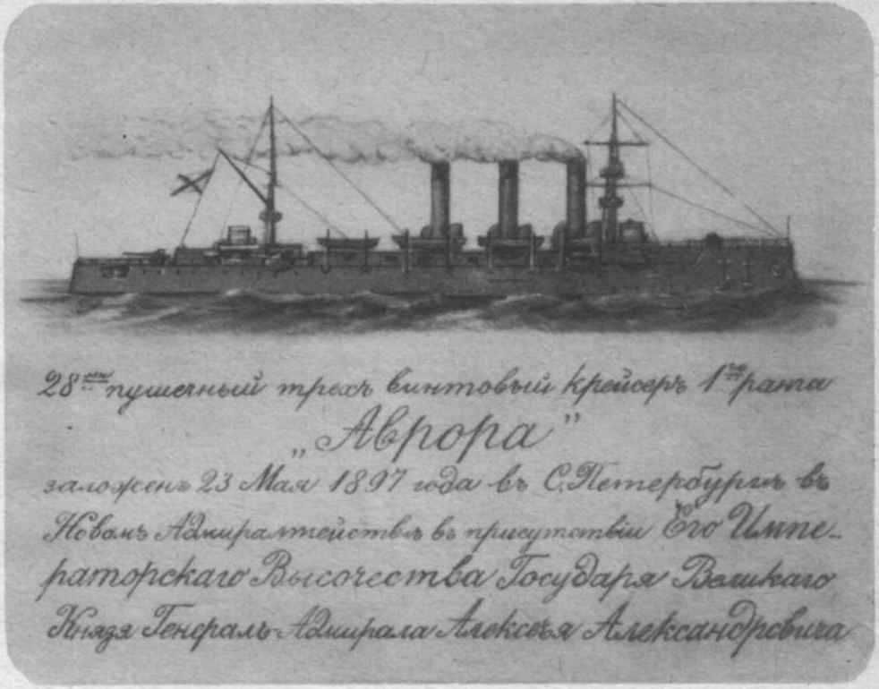 Крейсер "Аврора" был заложен в Санкт-Петербурге на судостроительной верфи "Новое адмиралтейство" 4 июня (23 мая по ст. ст.) 1897 года, спущен на воду 24 мая (11 мая по ст. ст.), по другим источникам 11 мая (28 апреля по ст. ст.) 1900 года, вступил в строй боевых кораблей флота России 29 июля (16 июля по ст. ст.) 1903 года.