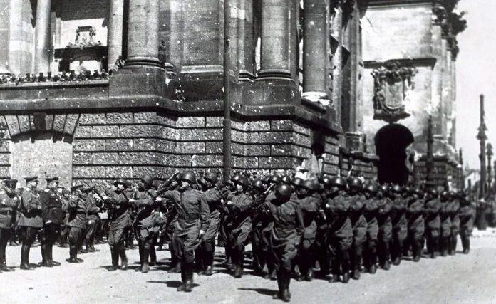 У Рейхстага и по площади Бранденбургских ворот торжественным маршем прошли солдаты и офицеры Берлинского гарнизона советских войск в своей полевой форме. В тех же гимнастерках, в которых штурмовали город. На окраинах города ещё слышались отзвуки последних боёв, но он уже был побеждён и слава советского воина-победителя прогремела на всю страну. Принимал парад военный комендант Берлина, командующий 5-й ударной армией генерал-полковник Николай Эрастович Берзарин, впоследствии первый комендант Берлина. Он был уверен, что парад должен проходить именно в центре Берлина у Рейхстага, на площади Бранденбургских ворот.