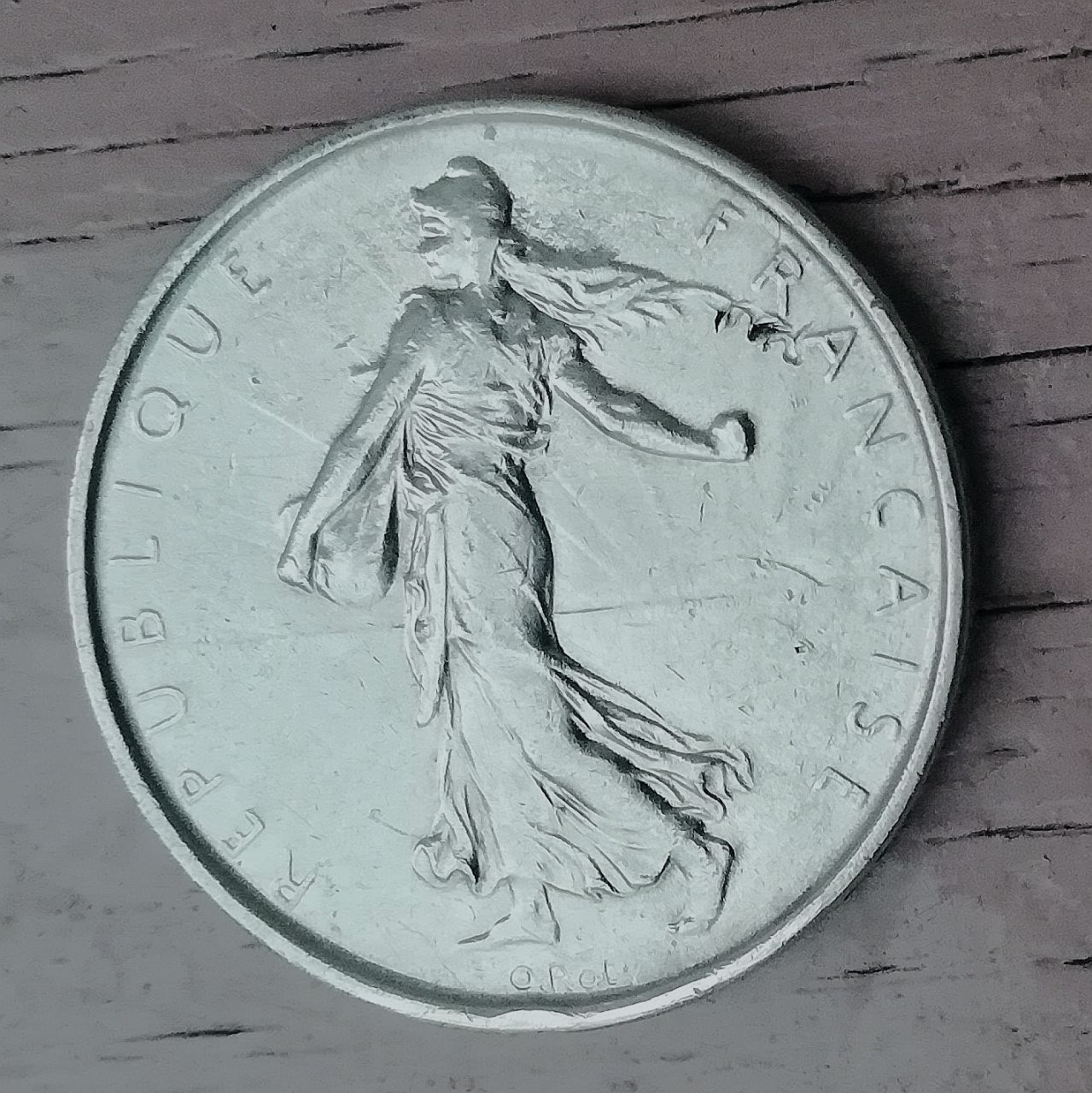 Большая серебряная монета Пятой Французской Республики с изображением сеятельницы Марианны.