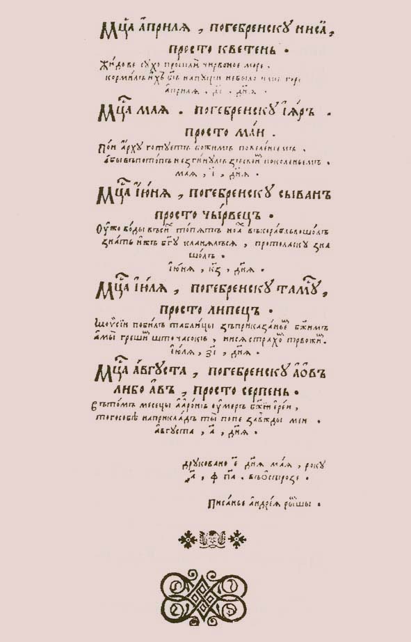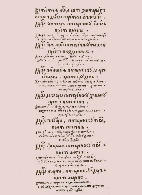 1581 - В городе Остроге вышел первый русский печатный календарь Ивана Фёдорова, который назывался "Хронология". К каждому месяцу были напечатаны стихи – двадцать двустиший "Которогося месяца што за старых веков деело короткое описание" белорусского поэта Андрея Рымши.