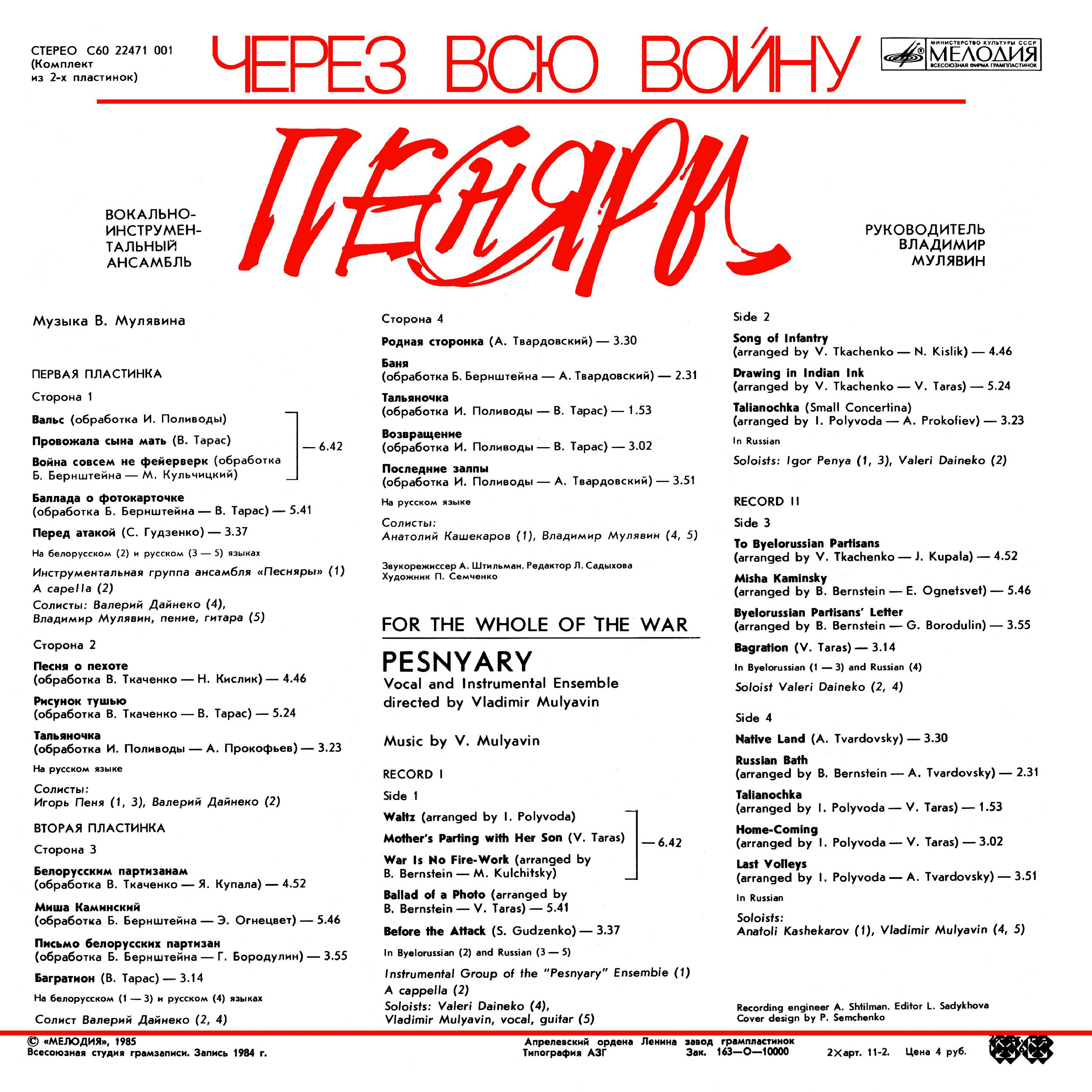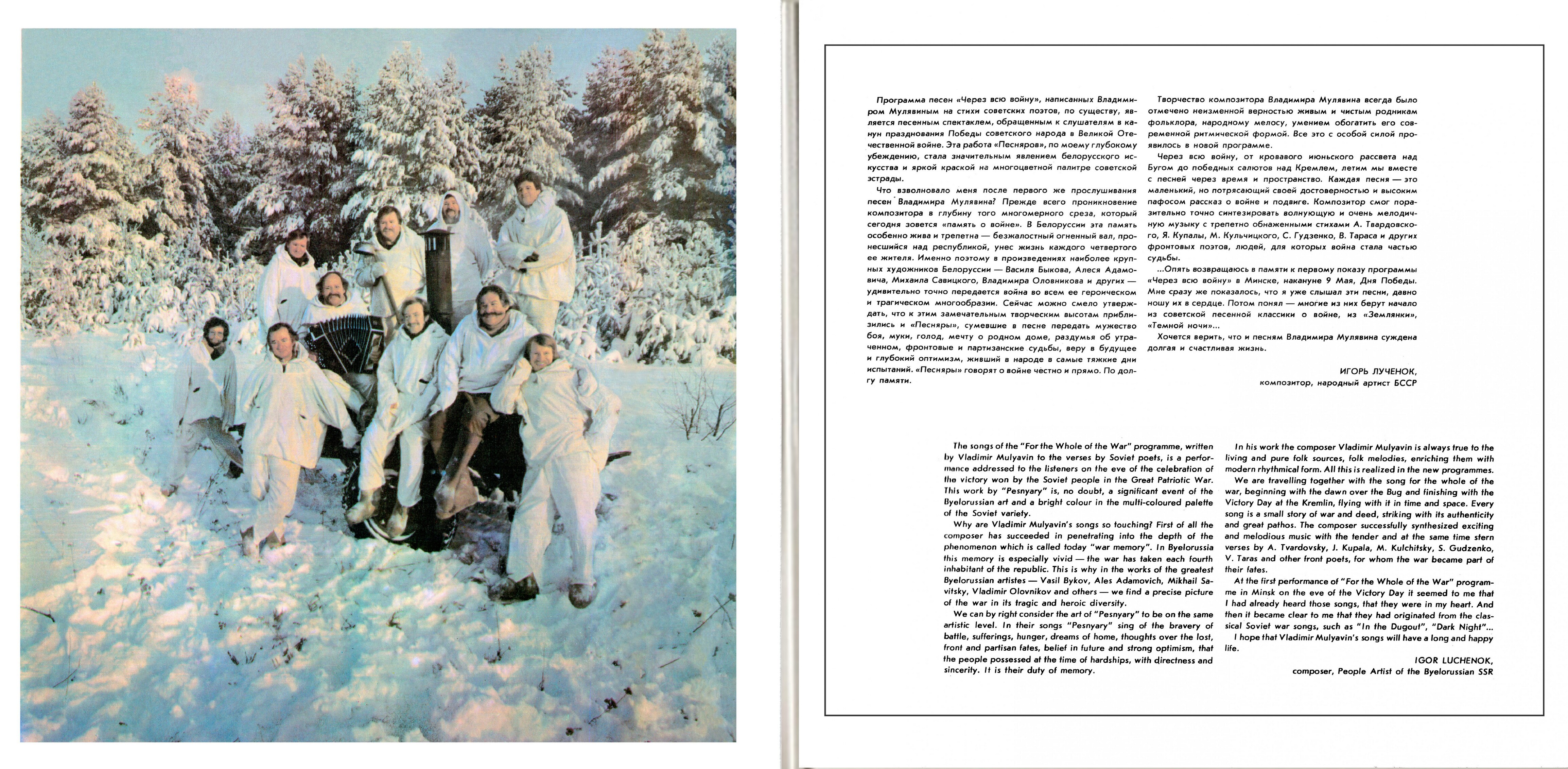 Программа песен «Через всю войну», написанных Владимиром Мулявиным на стихи советских поэтов, по существу, является песенным спектаклем, обращённым к слушателям в канун празднования Победы советского народа в Великой Отечественной войне. Эта работа «Песняров». по моему глубокому убеждению, стала значительным явлением белорусского искусства и яркой краской на многоцветной палитре советской эстрады...