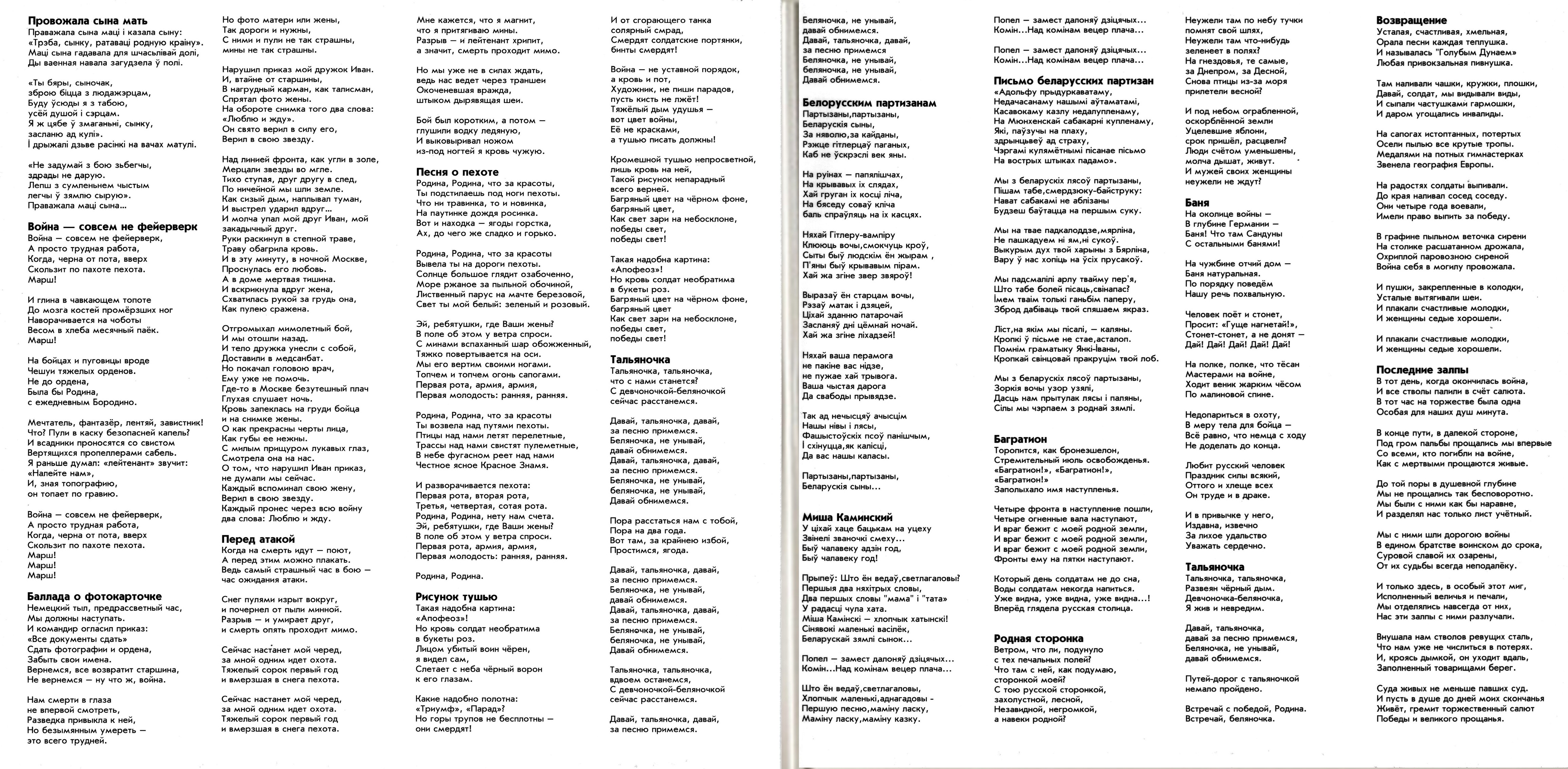 ... Опять возвращаяюсь в памяти к первому показу программы «Через всю войну» в Минске, накануне 9 Мая, Дня Победы. Мне сразу показалось, что я уже слышал эти песни, давно ношу их в сердце. Потом понял - многие из них берут начало из советской песенной классики о войне, из «Землянки», «Тёмной ночи»...