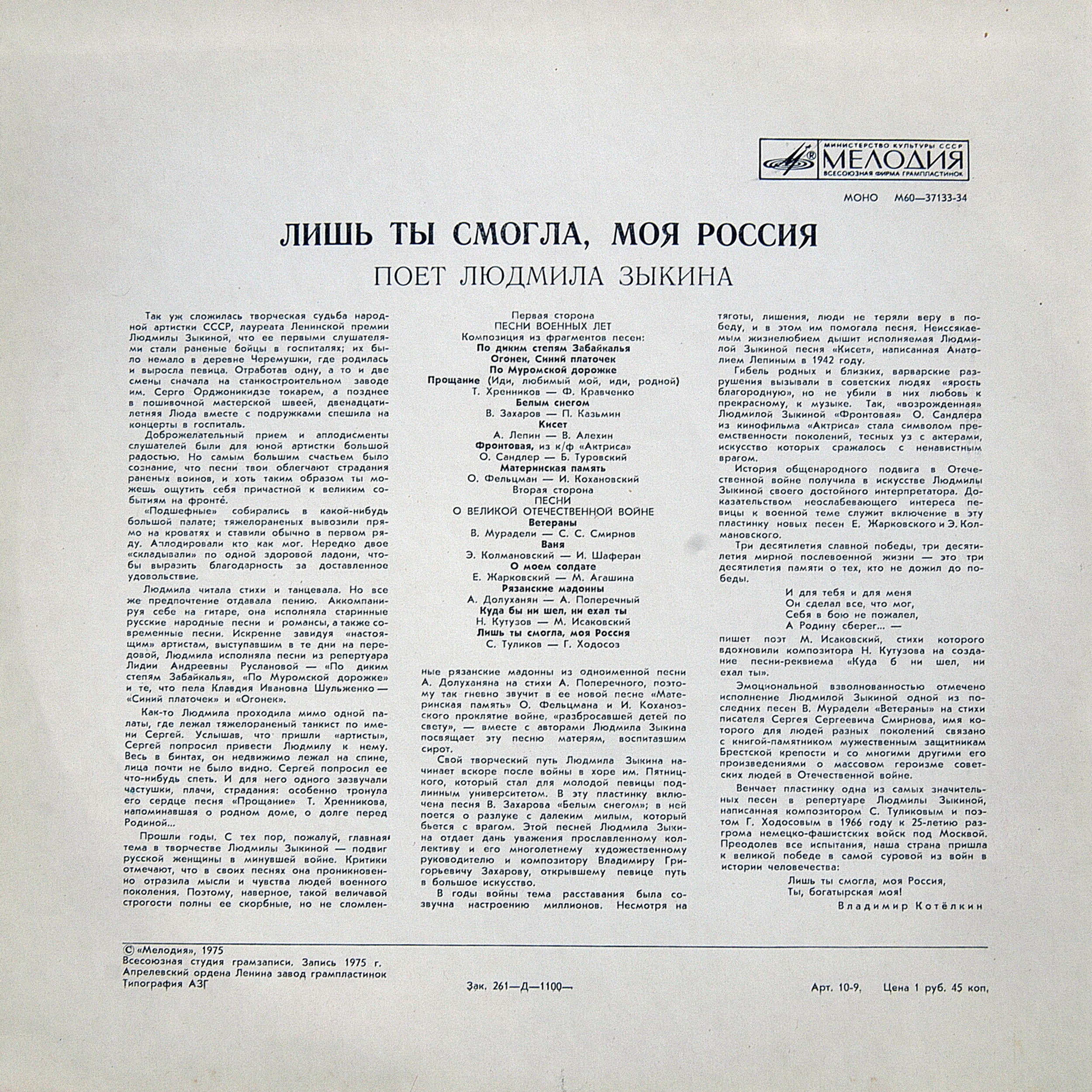 История общенародного подвига в Отечественной войне получила в искусстве Людмилы Зыкиной своего достойного интерпретатора. Доказательством неослабевающего интереса певицы к военной теме служит включение в эту пластинку новых песен Е.Жарковского и Э.Колмановского. Три десятилетия славной победы, три десятилетия мирной послевоенной жизни - это три десятилетия памяти о тех, кто не дожил до победы.