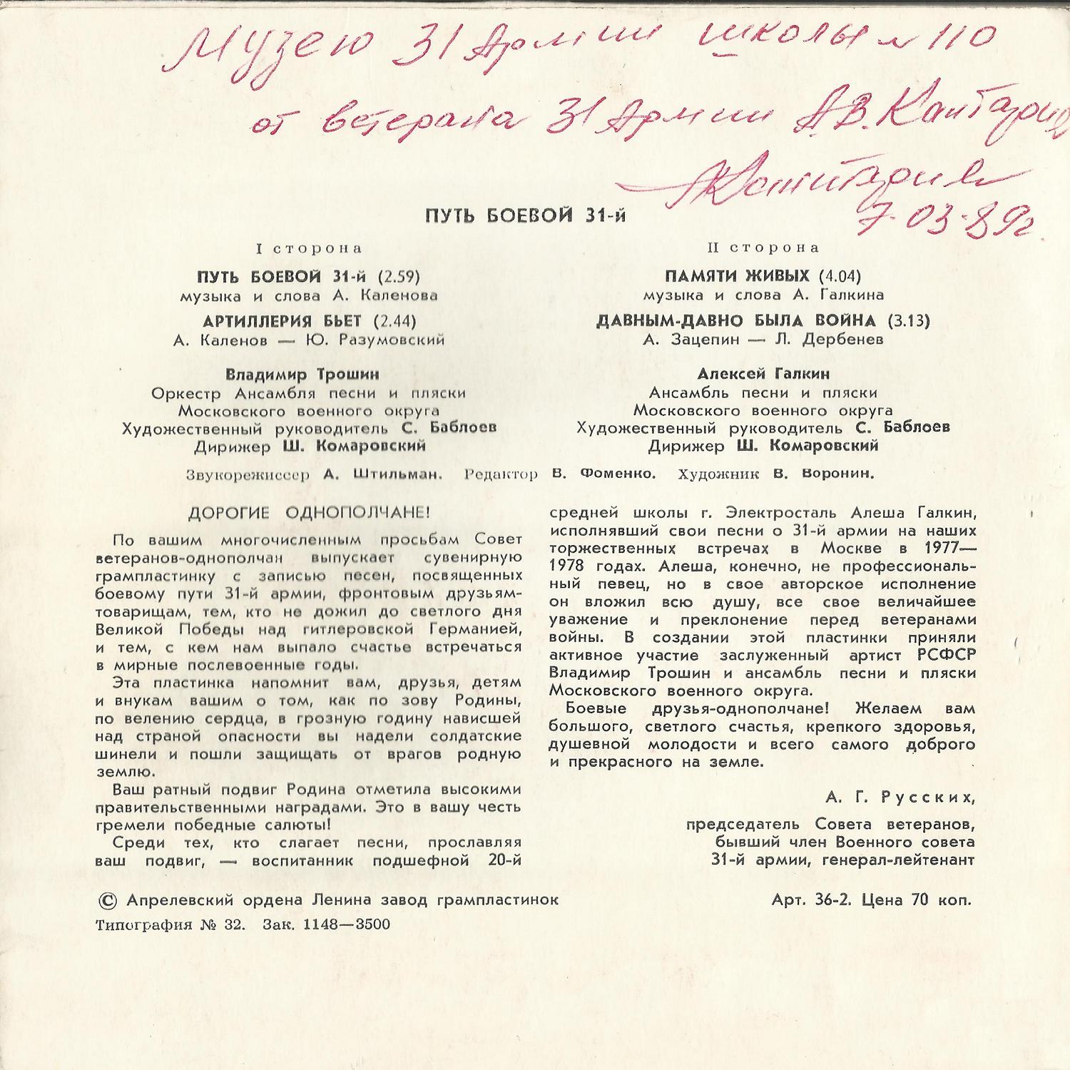По вашим многочисленным просьбам Совет ветеранов-однополчан выпускает сувенирную грампластинку с записью песен, посвящённых боевому пути 31-й армии, фронтовым друзьям-товарищам, там, кто не дожил до светлого дня Великой Победы над гитлеровской Германией, и тем, с кем нем вы пело счастье встречаться в мирные послевоенные годы.