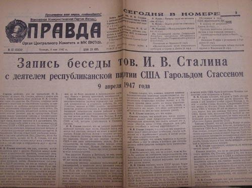 9 апреля 1947 года состоялось интервью И.В. Сталина с Гарольдом Стассеном, деятелем республиканской партии США, в 1939-1943 годах губернатором Миннесоты.