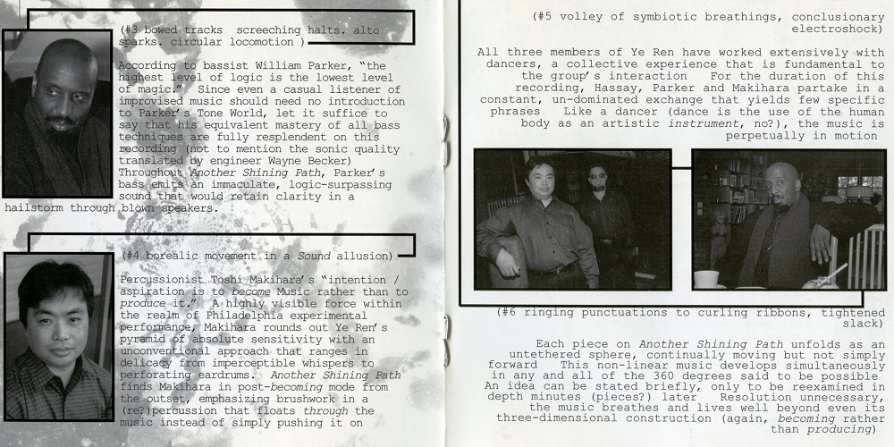 Альт-саксофонист Гэри Хассей возглавляет великолепное трио под названием YE REN (название, по словам Хассея, «не имеет реального значения») для своего дебютного (и ставшего единственным) альбома «Another Shining Path», 1999 года. Восемь треков отличаются тонким взаимодействием, синергией и уникальным стилем. Вместе со звёздным басистом Уильямом Паркером и блистательным филадельфийским перкуссионистом Тоши Макихарой группа добивается чего-то особенного почти в каждой композиции.