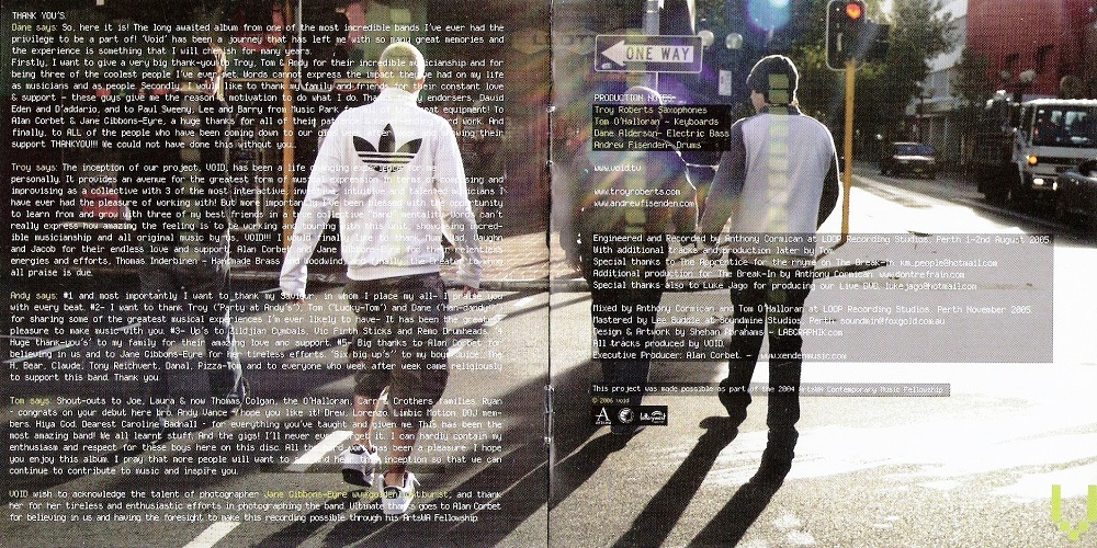 "Void" (2006) - термоядерная смесь из джаза, хип-хопа, R&B, соула, фанка и латиноамериканской музыки – и хотя это часть их прошлого, её обязательно стоит послушать! Void (Australia): Troy Roberts (saxophone), Dane Alderson (bass), Andy Fisenden (drums), Tom O'Halloran (keyboards) ©