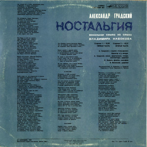 «Если мне не изменяет память, впервые Набоков был напечатан в 1986 году в шахматном журнале «64» — кажется, отрывок из «Защиты Лужина» или части рассказов... Набоковский цикл я закончил в середине 1980-х, без всякой надежды на выпуск пластинки. Один знакомый спросил, зачем я это делаю, ведь Набоков у нас не разрешён. Мало ли что, ответил я, завтра могут и разрешить. Вскоре появилась эта публикация, а ещё через пару лет вышла пластинка «Ностальгия» с моей вокальной сюитой на стихи Набокова. Поэтому нужно следовать своим желаниям, а не конъюнктуре».
