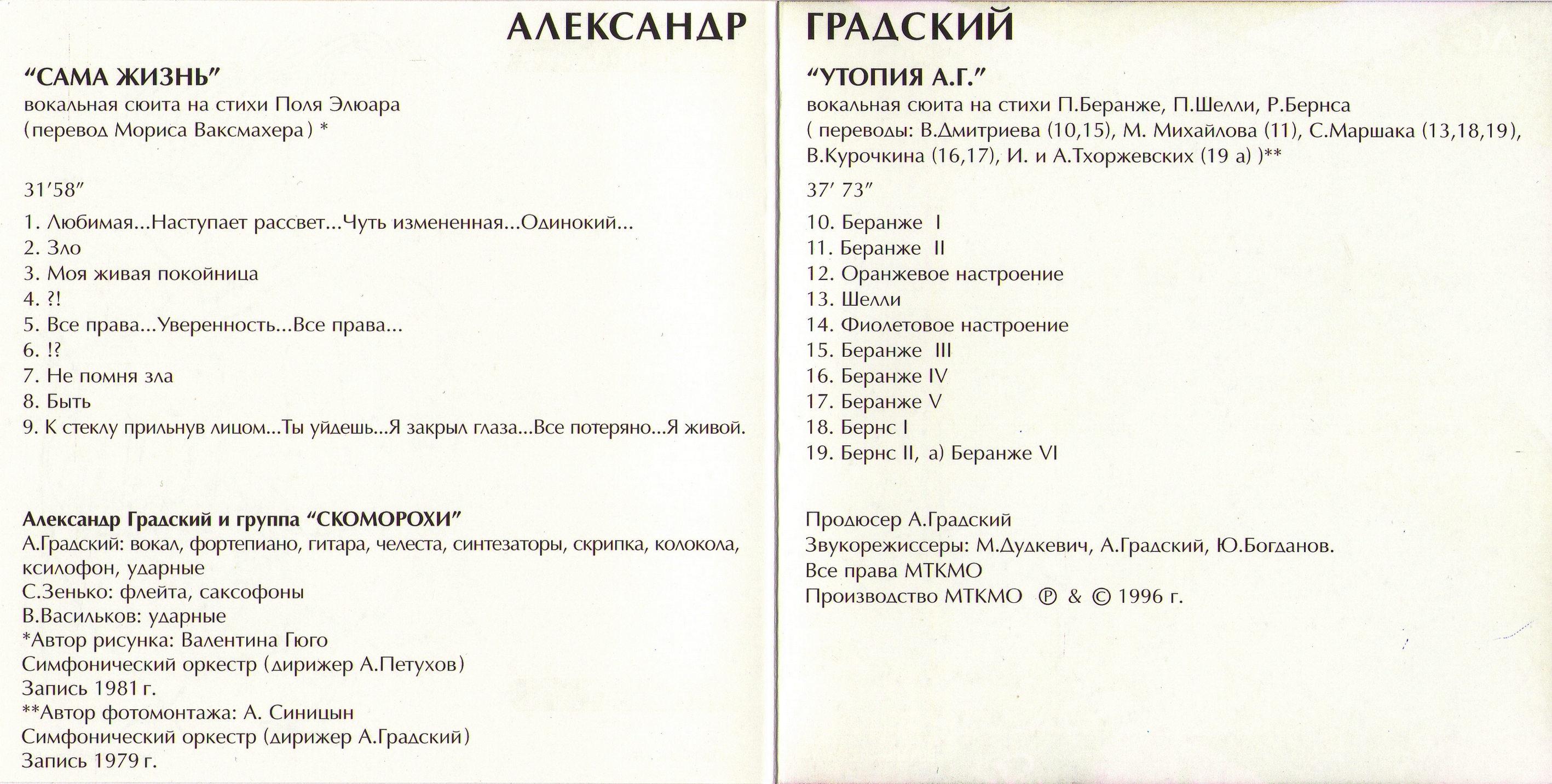 Звукорежиcсёр – А.Градский, М.Дудкевич, Ю.Богданов