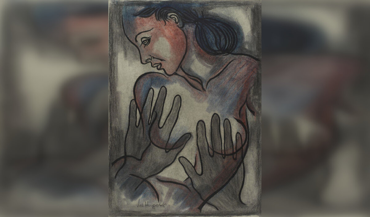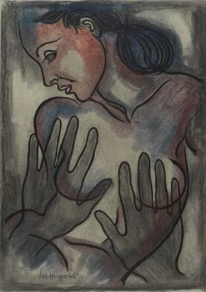 На картине изображена женщина с опущенной головой, а на ее груди лежат две руки, предположительно принадлежащие ей самой.