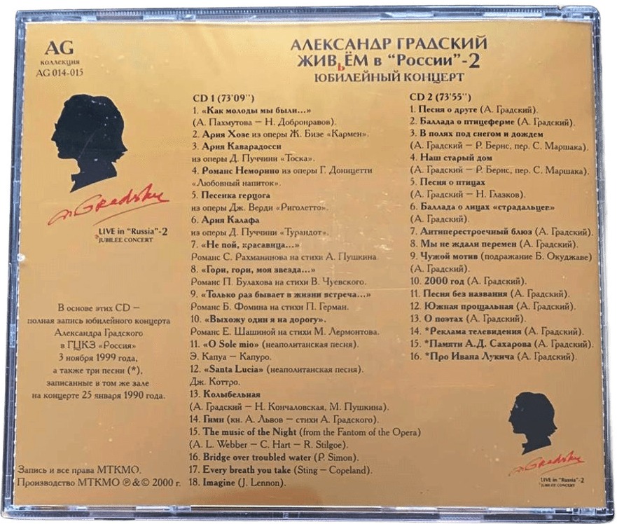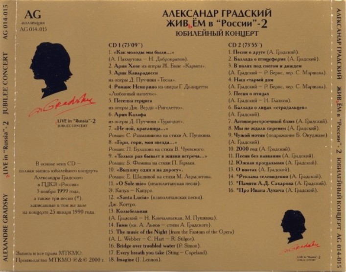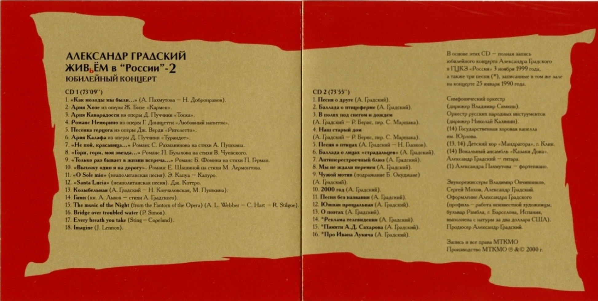 В основе этих CD - полная запись юбилейного концерта Александра Градского в ГЦКЗ «Россия» 3 ноября 1999 года, а также три песни (*), записанные в том же зале на концерте 25 января 1990 года.