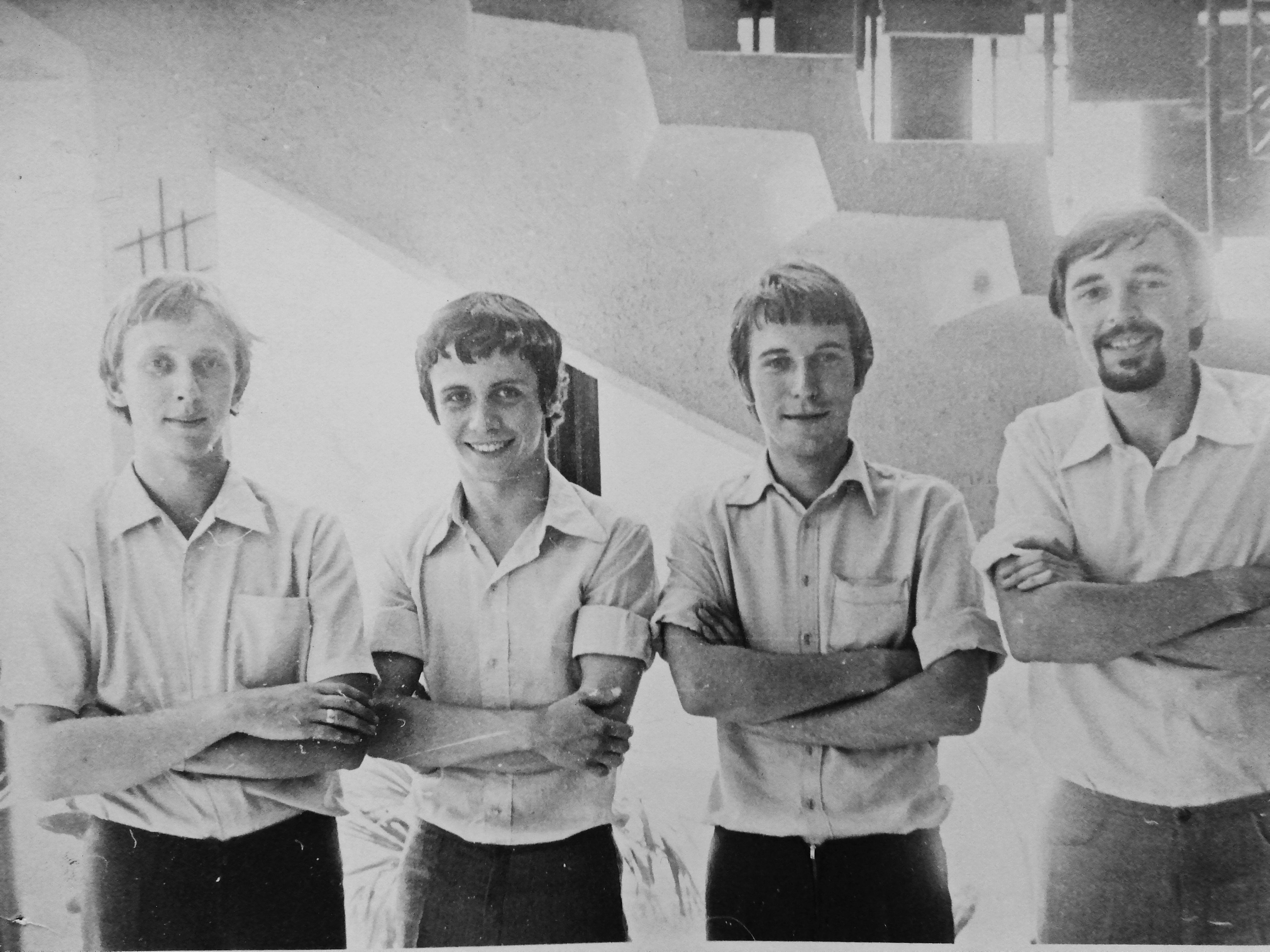 На снимке (слева направо – первый состав): Владимир Шуравин (клавишные, вокал). Александр Мачульский (гитара, вокал), Николай Егоров (бас-гитара), Александр Кочуров (барабаны).