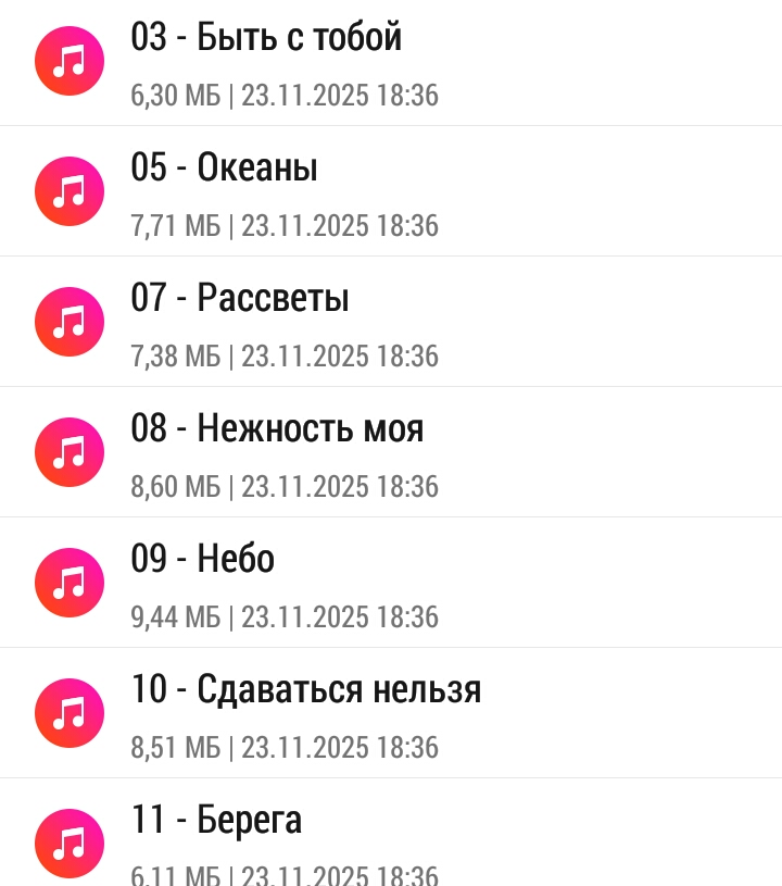 1. Айсберги 2. Мне нужен ответ 3. Быть с тобой 4. Не провожай 5. Океаны 6. Мокрые спички 7. Рассветы 8. Нежность моя 9. Небо 10. Сдаваться нельзя 11. Берега