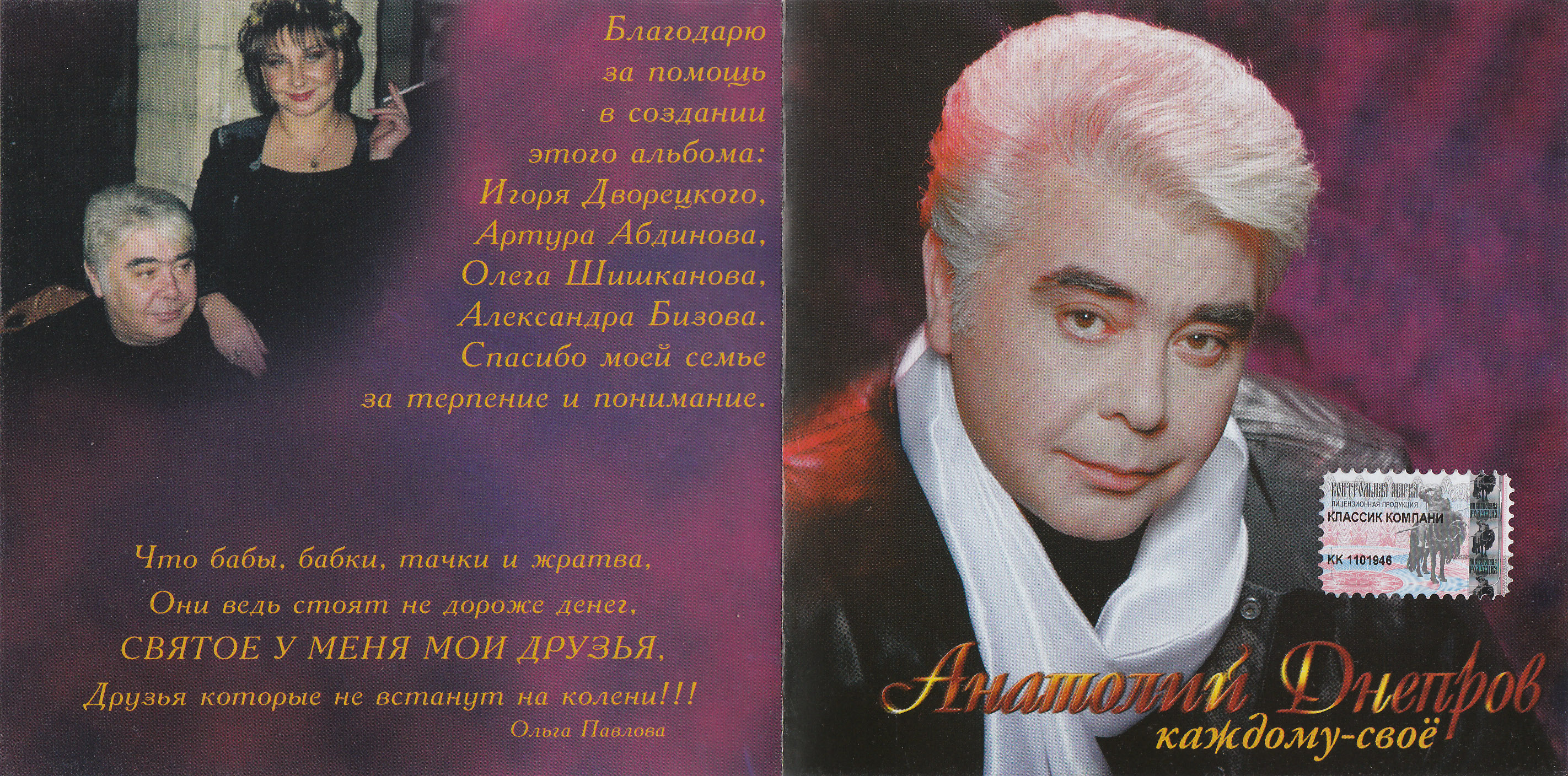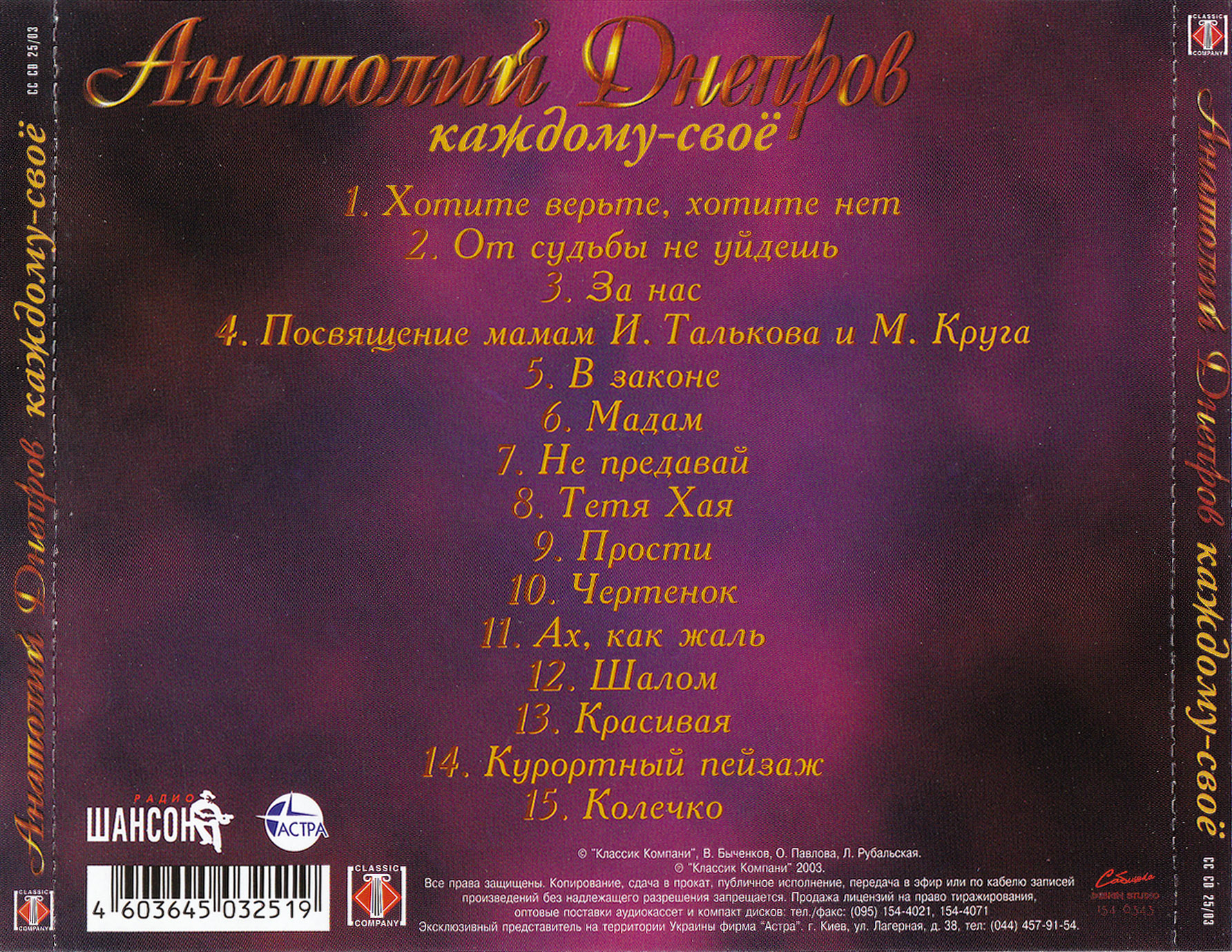 ☆ ► Альбом «Каждому — своё» Анатолия Днепрова, выпущенный в 2003 году, продолжает традиции его предыдущих работ, предлагая слушателям глубокие, эмоциональные и разносторонние композиции. Днепров, известный своим мастерством создания запоминающихся мелодий и текстов, снова демонстрирует своё умение сочетать разные стили и темы в рамках одного альбома.