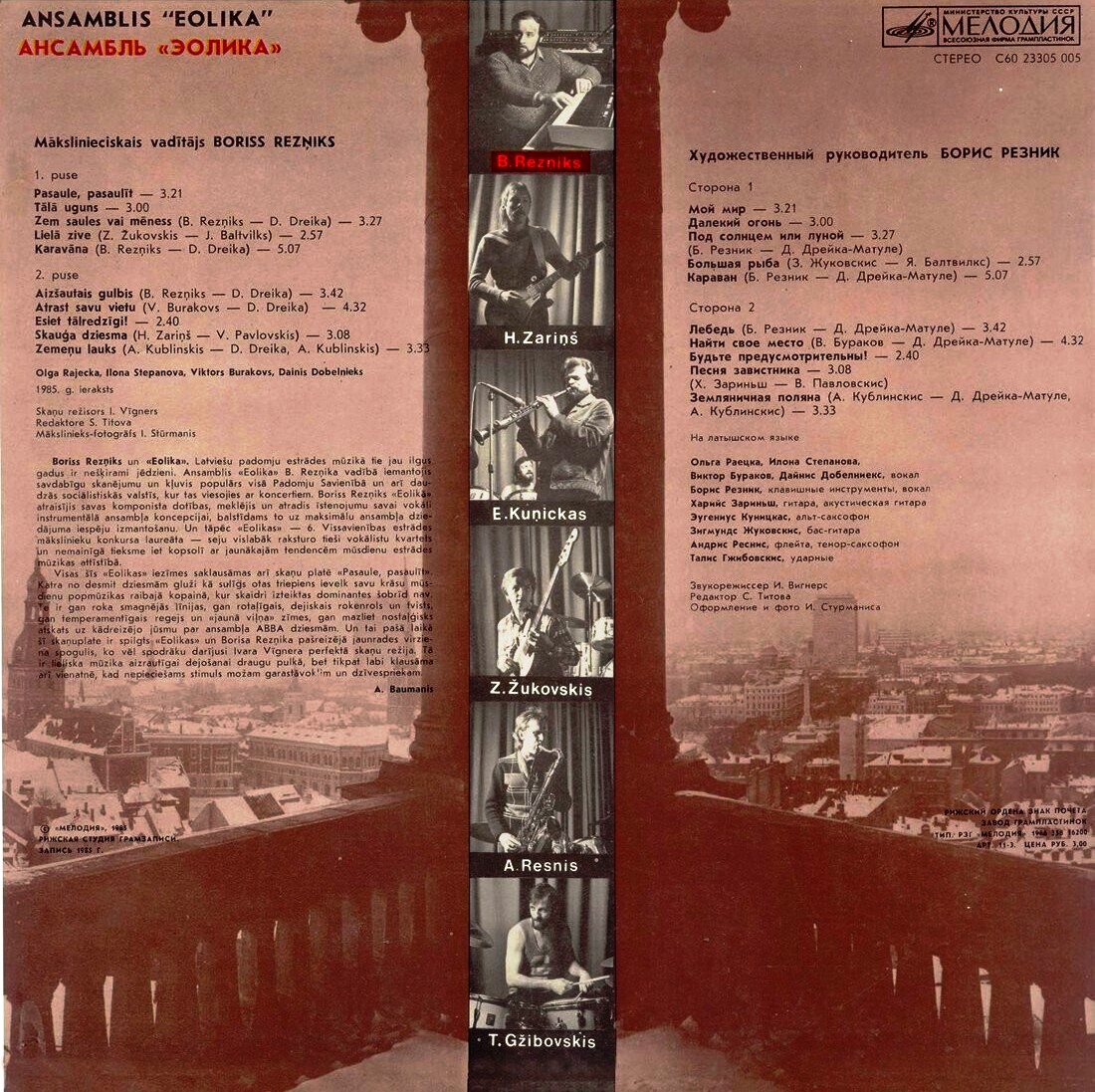► Boriss Rezņiks un «Eolika». Latviešu padomju estrādes mūzikā tie jau ilguj gadus ir nešķirami jēdzieni. Ansamblis «Eolika» B. Rezņika vadībā iemantojis savdabīgu skanējumu un kļuvis populārs visā Padomju Savienībā un arī daudzās sociālistiskās valstīs, kur tas viesojies ar koncertiem. Boriss Rezņiks «Eolika» atraisījis savas komponista dotības, meklējis un atradis īstenojumu savai vokāli; instrumentālā ansambļa koncepcijai, balstīdams to uz maksimālu ansambļa dzie*: dājuma iespēju izmantošanu. Un tāpēc «Eolikas» — 6. Vissavienības estrādes mākslinieku konkursa laureāta — seju vislabāk raksturo tieši vokālistu kvartets, un nemainīgā tieksme iet kopsolī ar jaunākajām tendencēm mūsdienu estrādes lūzikas attīstībā.