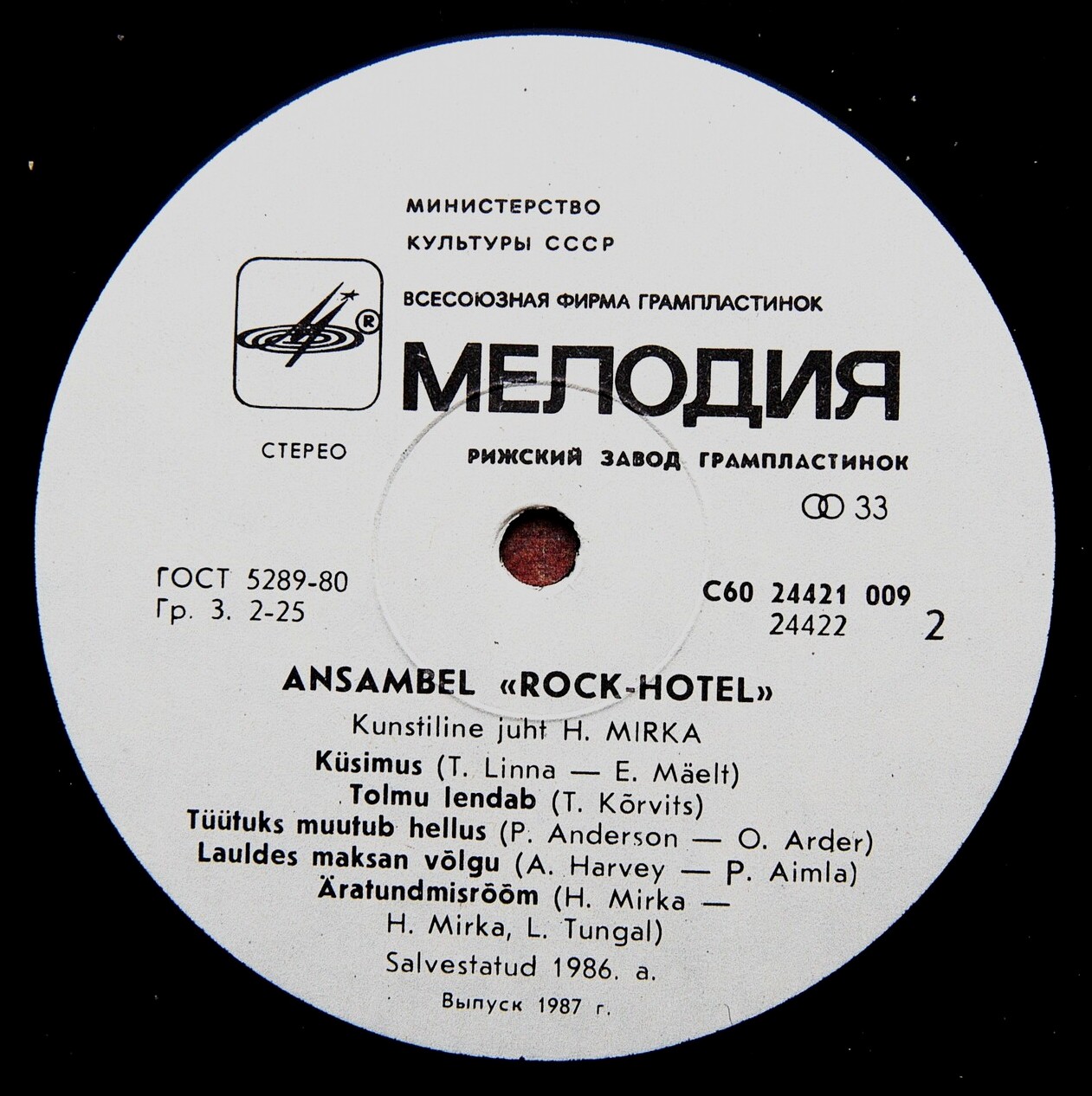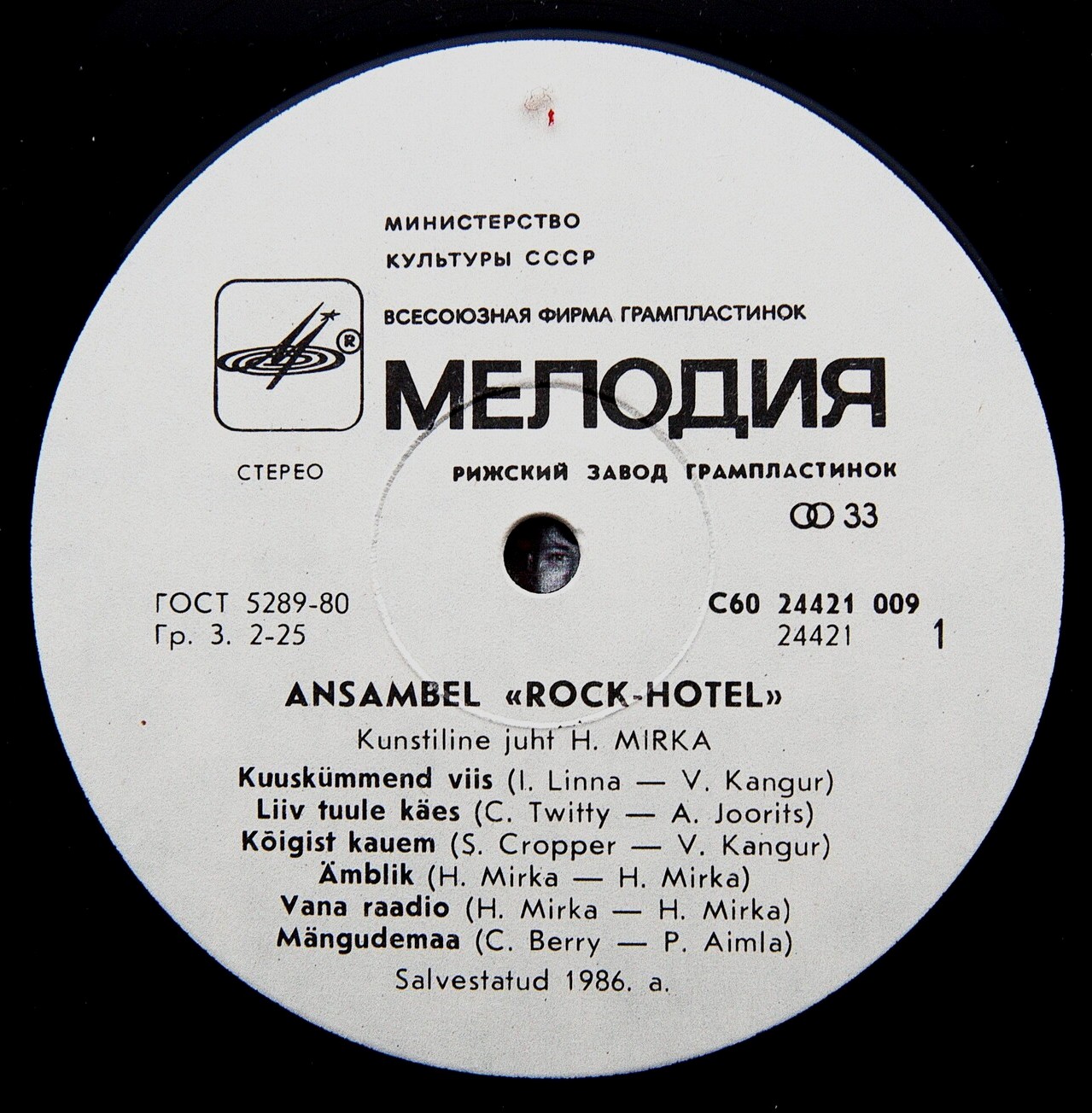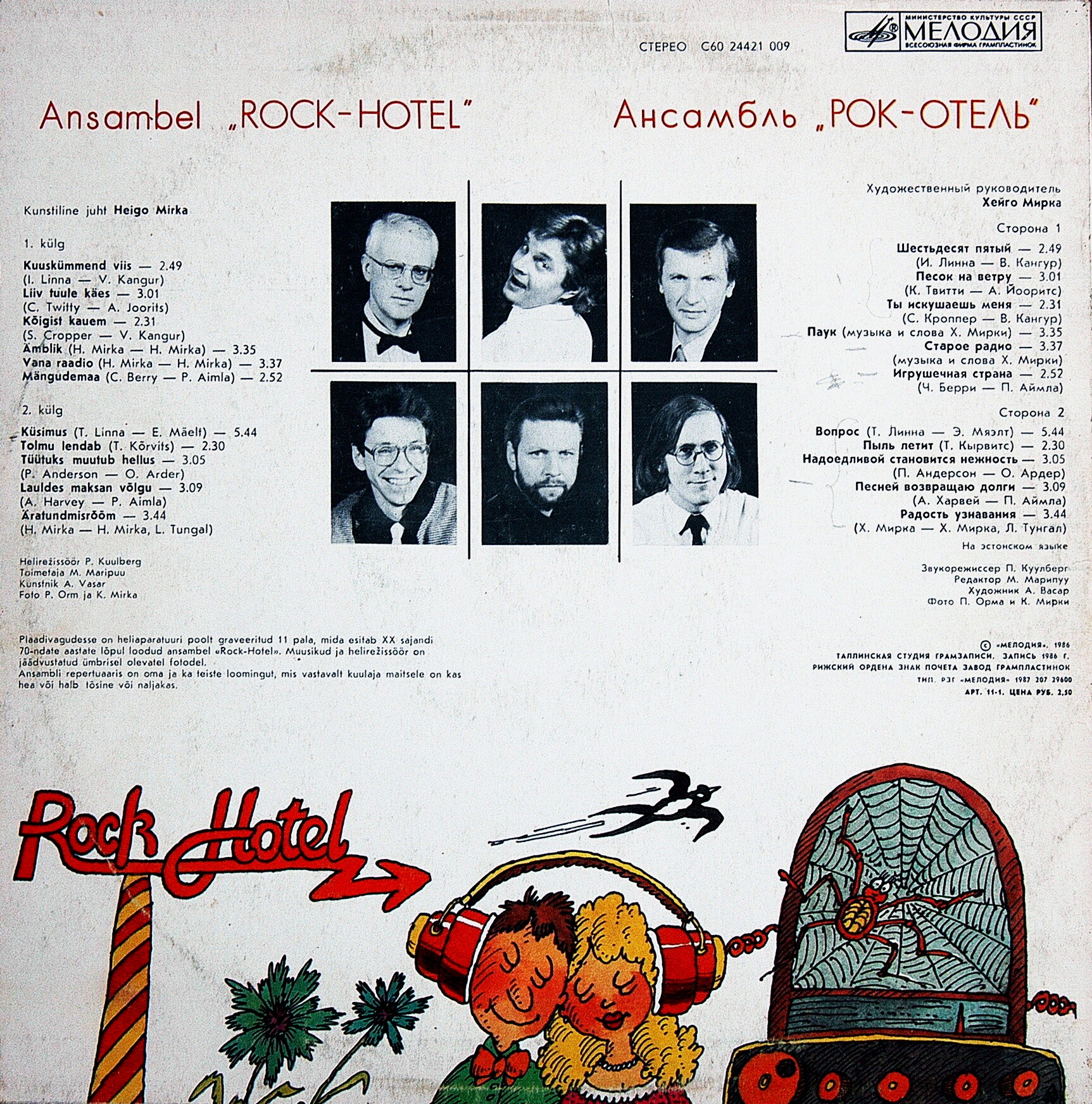 ► Звуковое оборудование врезало в дорожки пластинки 11 треков, которые исполняет группа «Рок-Отель», созданная в конце 70-х годов XX века. Музыканты и звукорежиссёр запечатлены на фотографиях на обложке.