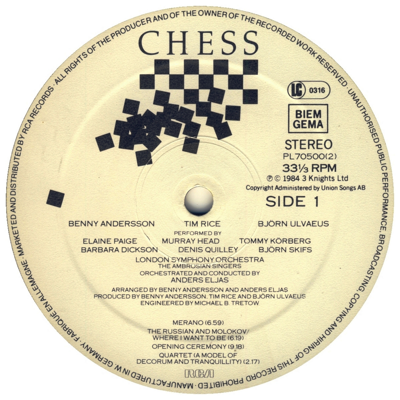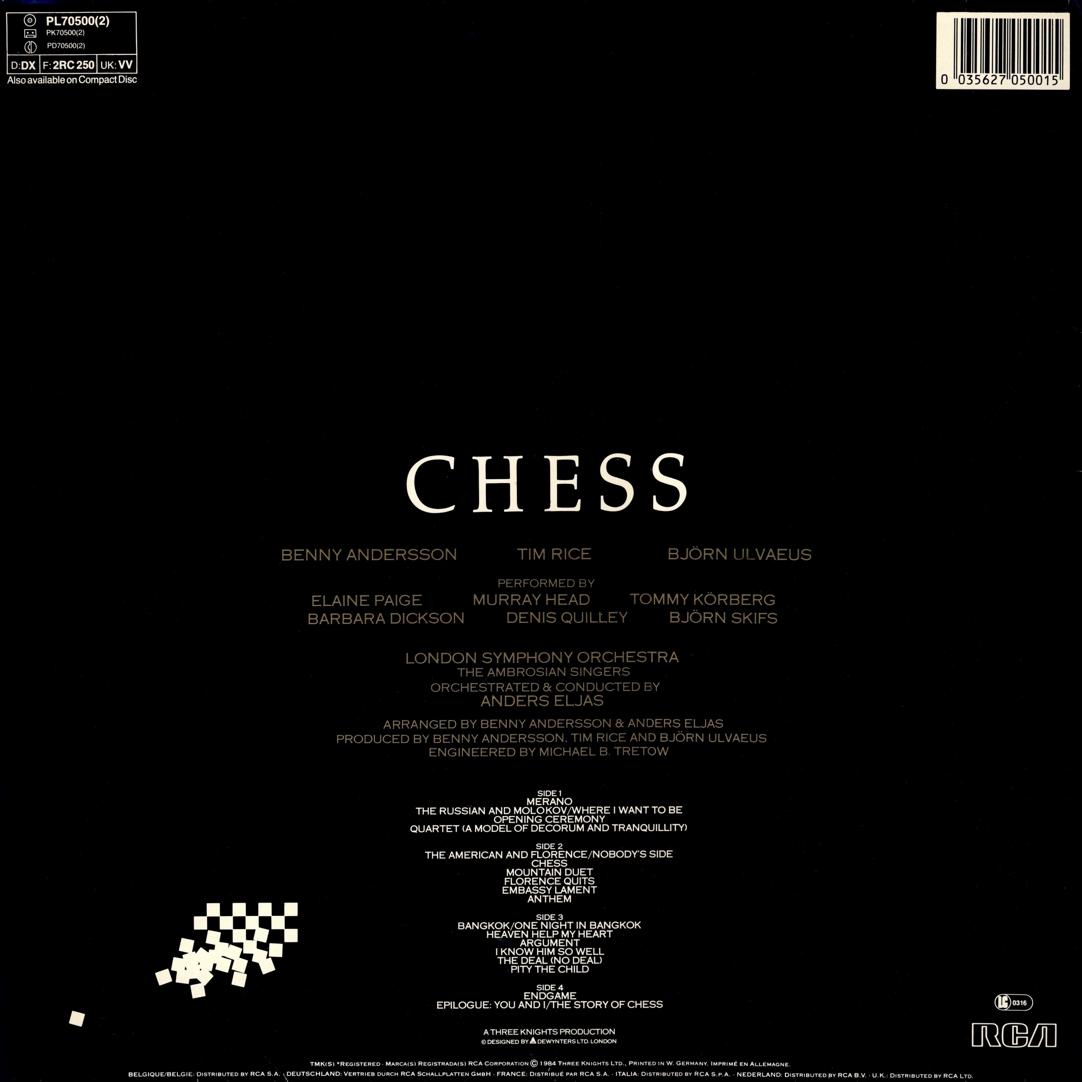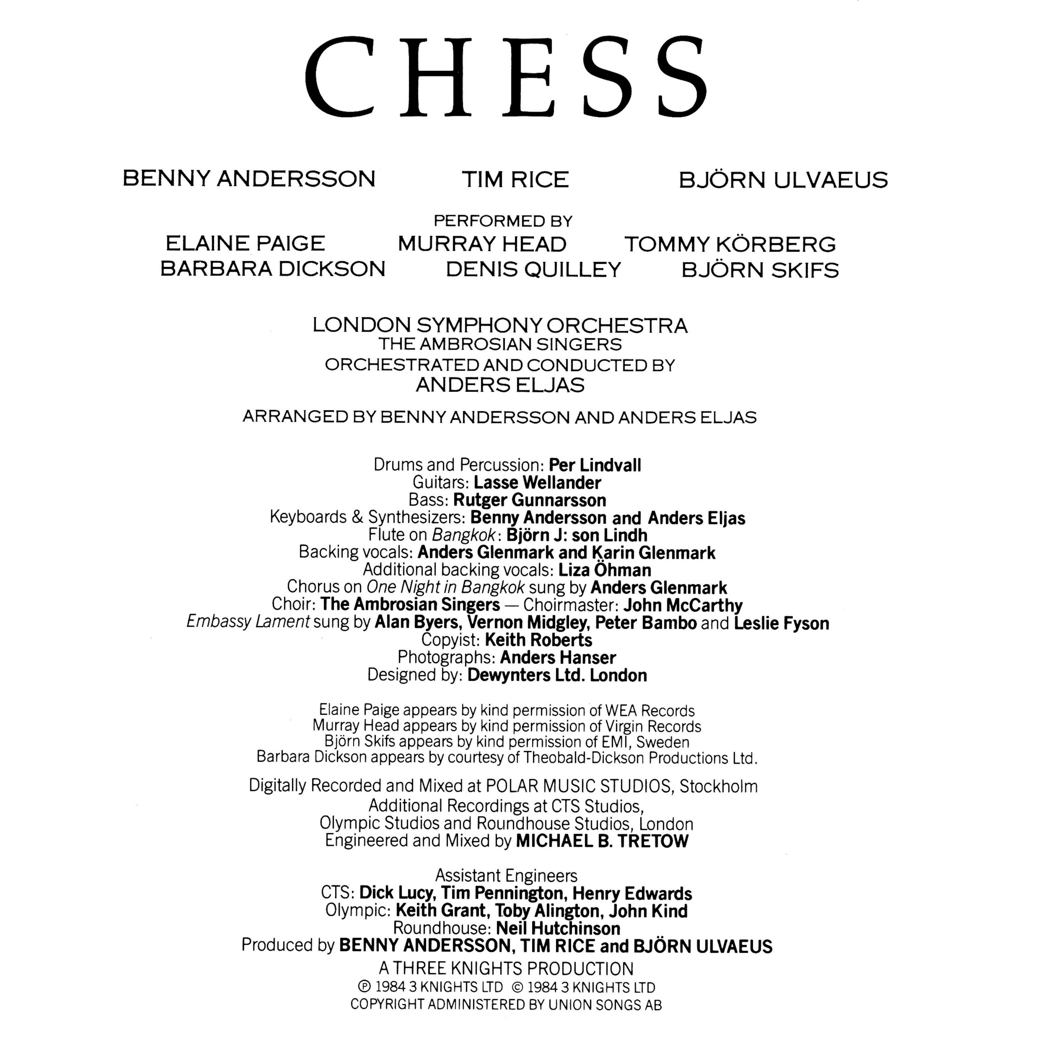 Запись лондонского симфонического оркестра проходила в Лондоне. Аранжировщиком, и дирижёром выступил молодой швед Андерс Эльяс, участвующий ранее в гастролях ABBA клавишником, и делавшим для некоторых песен группы аранжировки. Ни Бьёрн, ни Бенни так и не потрудились освоить нотную грамоту. По их признанию, работа над «Шахматами» доставила им несравнимо большее удовольствие и интерес, нежели работа над каким либо из альбомов группы ABBA ранее. Музыка и исполнение поп-оперы по своим масштабам, по своему размаху, по эмоциональному накалу разительно отличалась от всего того, что ранее сочиняли Бенни Андерссон и Бьёрн Ульвеус. В двойном оригинальном альбоме роль американца исполнил Мюррей Хэд, советского гроссмейстера — швед Томми Чёрберг, его возлюбленной Флоренс — Элейн Пейдж, а Барбара Диксон сыграла жену русского Светлану. Два сингла из мюзикла — «Одна ночь в Бангкоке» (One Night In Bangkok) и «Я так хорошо его знаю» (I Know Him So Well) — возглавили английский и американский хит-парады. Двойной альбом был продан в общей сложности двухмиллионным тиражом. «Шахматы» продемонстрировали всем, что Тим Райс способен создавать удачные произведения и без Эндрю Ллойда Уэббера: во многих странах альбом с записью «Шахмат» расходился гораздо лучше, чем запись «Призрака Оперы» Ллойда Уэббера, вышедшая в те же годы.