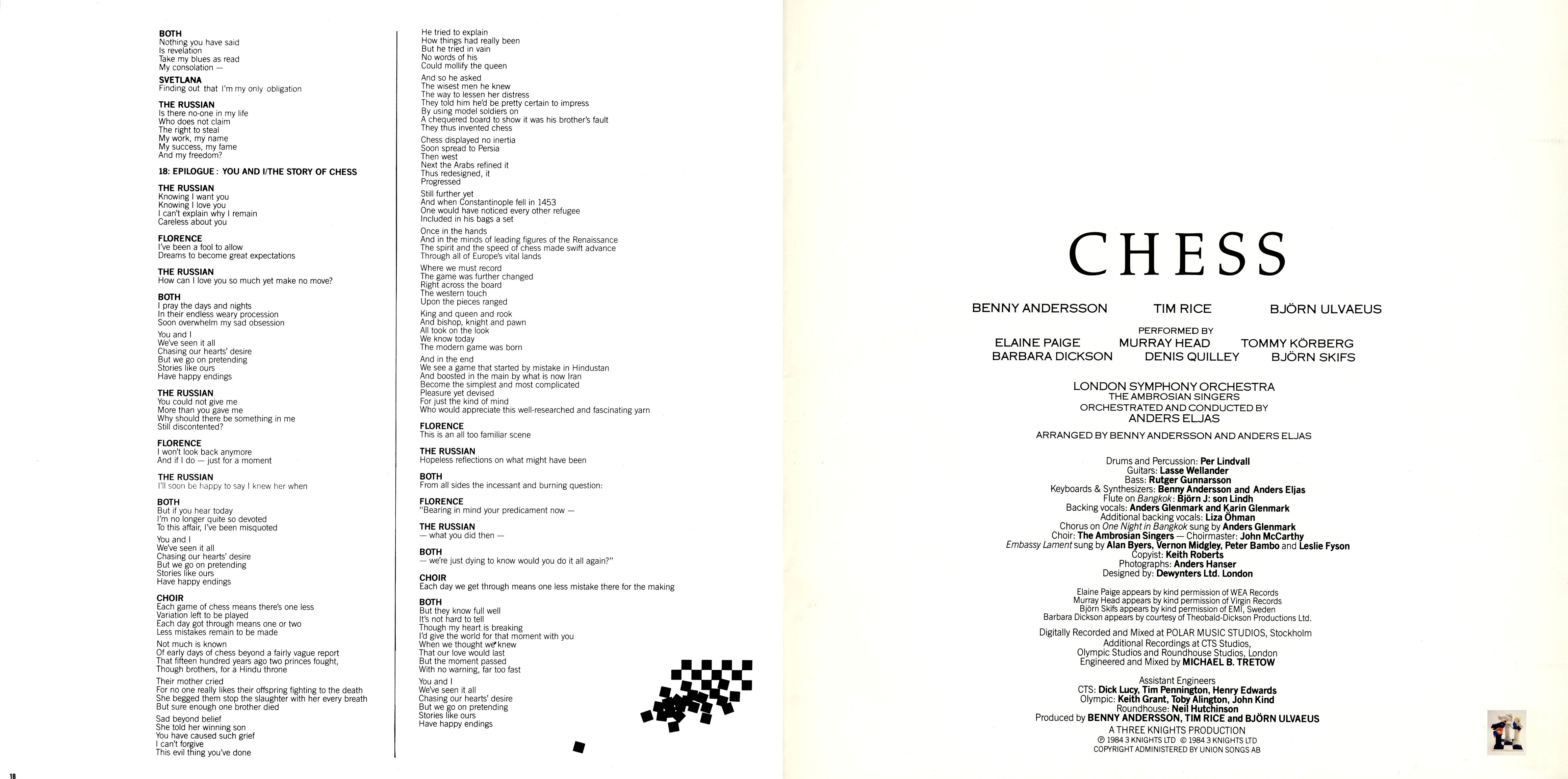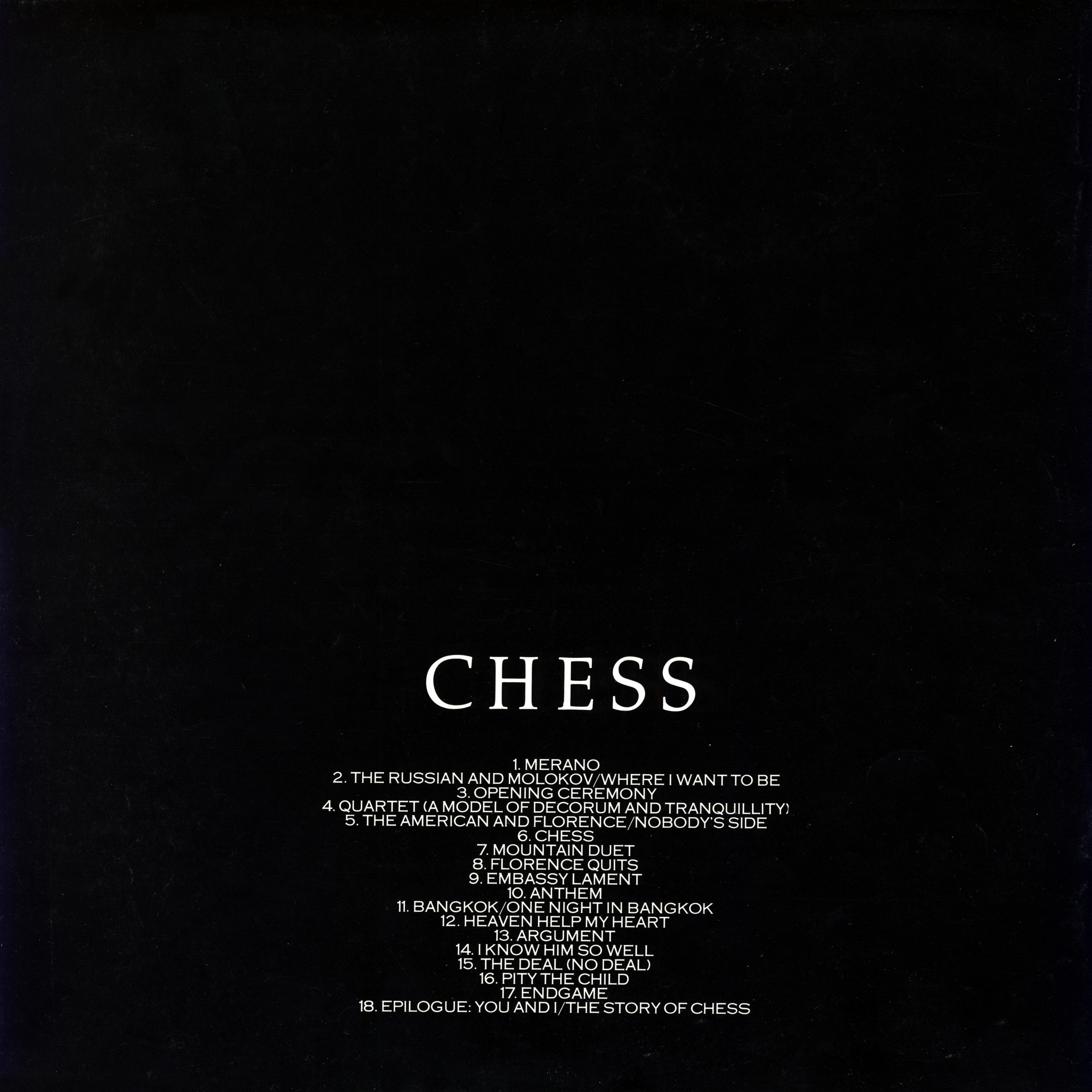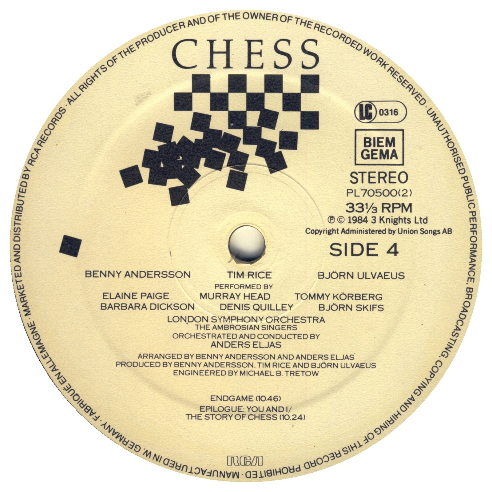 Запись лондонского симфонического оркестра проходила в Лондоне. Аранжировщиком, и дирижёром выступил молодой швед Андерс Эльяс, участвующий ранее в гастролях ABBA клавишником, и делавшим для некоторых песен группы аранжировки. Ни Бьёрн, ни Бенни так и не потрудились освоить нотную грамоту. По их признанию, работа над «Шахматами» доставила им несравнимо большее удовольствие и интерес, нежели работа над каким либо из альбомов группы ABBA ранее. Музыка и исполнение поп-оперы по своим масштабам, по своему размаху, по эмоциональному накалу разительно отличалась от всего того, что ранее сочиняли Бенни Андерссон и Бьёрн Ульвеус. В двойном оригинальном альбоме роль американца исполнил Мюррей Хэд, советского гроссмейстера — швед Томми Чёрберг, его возлюбленной Флоренс — Элейн Пейдж, а Барбара Диксон сыграла жену русского Светлану. Два сингла из мюзикла — «Одна ночь в Бангкоке» (One Night In Bangkok) и «Я так хорошо его знаю» (I Know Him So Well) — возглавили английский и американский хит-парады. Двойной альбом был продан в общей сложности двухмиллионным тиражом. «Шахматы» продемонстрировали всем, что Тим Райс способен создавать удачные произведения и без Эндрю Ллойда Уэббера: во многих странах альбом с записью «Шахмат» расходился гораздо лучше, чем запись «Призрака Оперы» Ллойда Уэббера, вышедшая в те же годы.