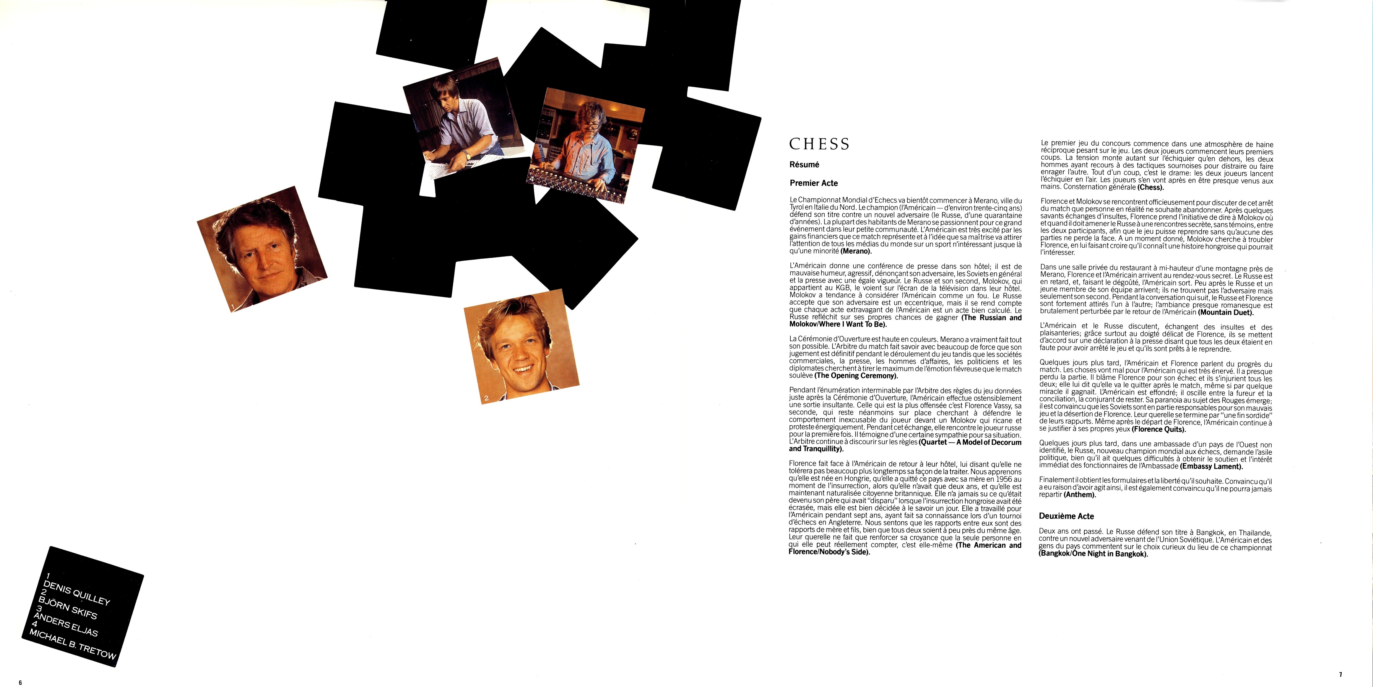 В конце января 1983 года Бьорн, Бенни и Тим приехали в Москву, чтобы познакомиться с советской атмосферой. За три дня в столице они побывали в Большом театре, посмотрев балет «Щелкунчик», прогулялись по Красной площади, а также посетили один из концертов Аллы Пугачёвой, проходивший в концертном зале Олимпийской деревни. Познакомившись с известной советской певицей, после недолгих размышлений авторы будущего произведения предложили ей исполнить роль жены русского шахматиста, однако этому не суждено было сбыться. Советское правительство тех лет не дало бы Алле разрешения на длительный выезд за пределы СССР, требуемый для репетиции мюзикла, которая составляла собой 11 месяцев в общей сложности.