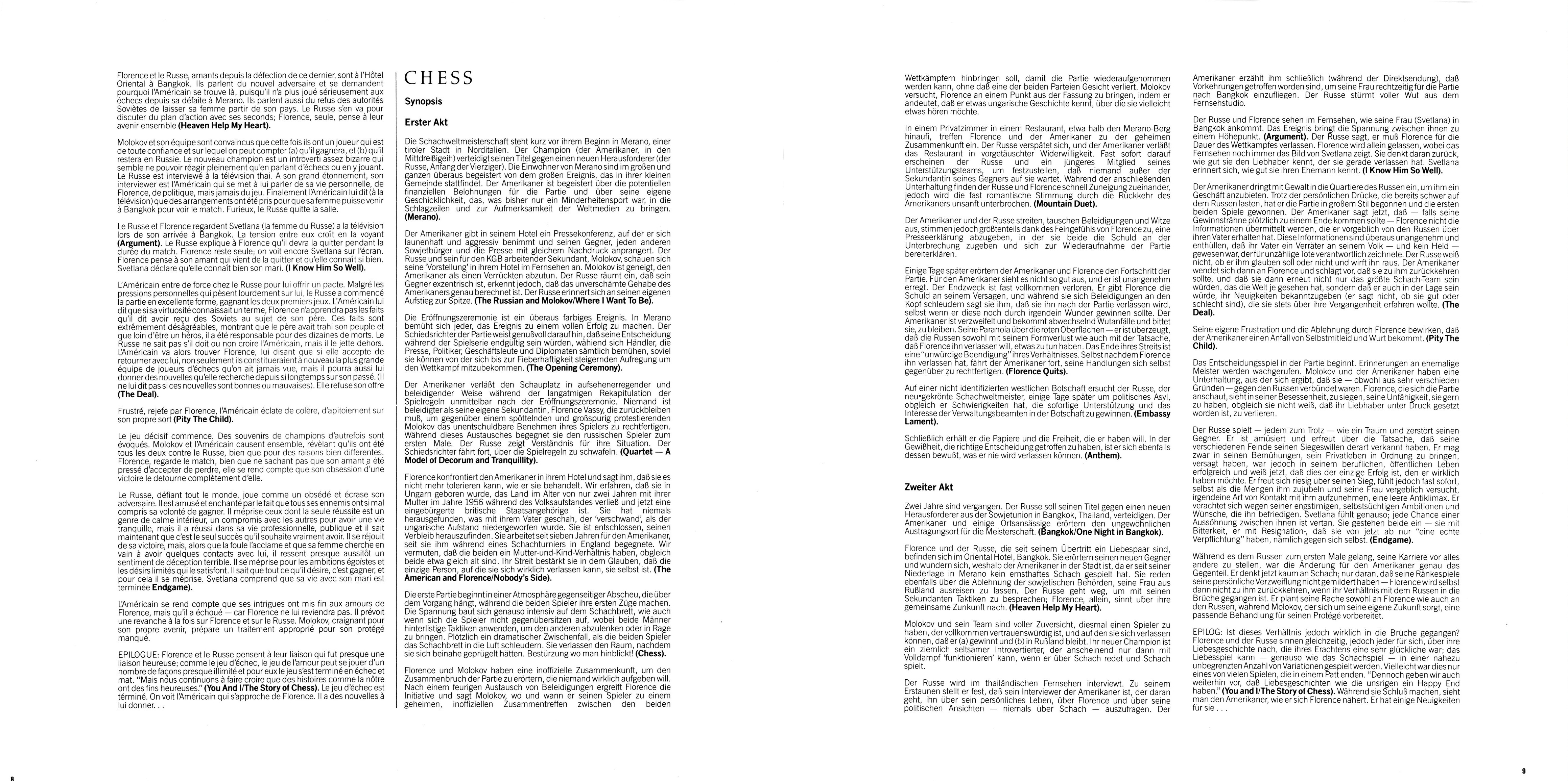 Мюзикл повествует о поединке двух шахматистов: русского (Анатолия Сергиевского) и американского (Фредерика Трампера). Американский персонаж основан на эксцентричном чемпионе мира по шахматам Бобби Фишере (1972—1975), а русский — на его сопернике в матче за звание чемпиона 1972 года Борисе Спасском, и участниках первенств 1978 и 1981 (в Мерано, Италия) годов Анатолии Карпове и эмигрировавшем из СССР Викторе Корчном.