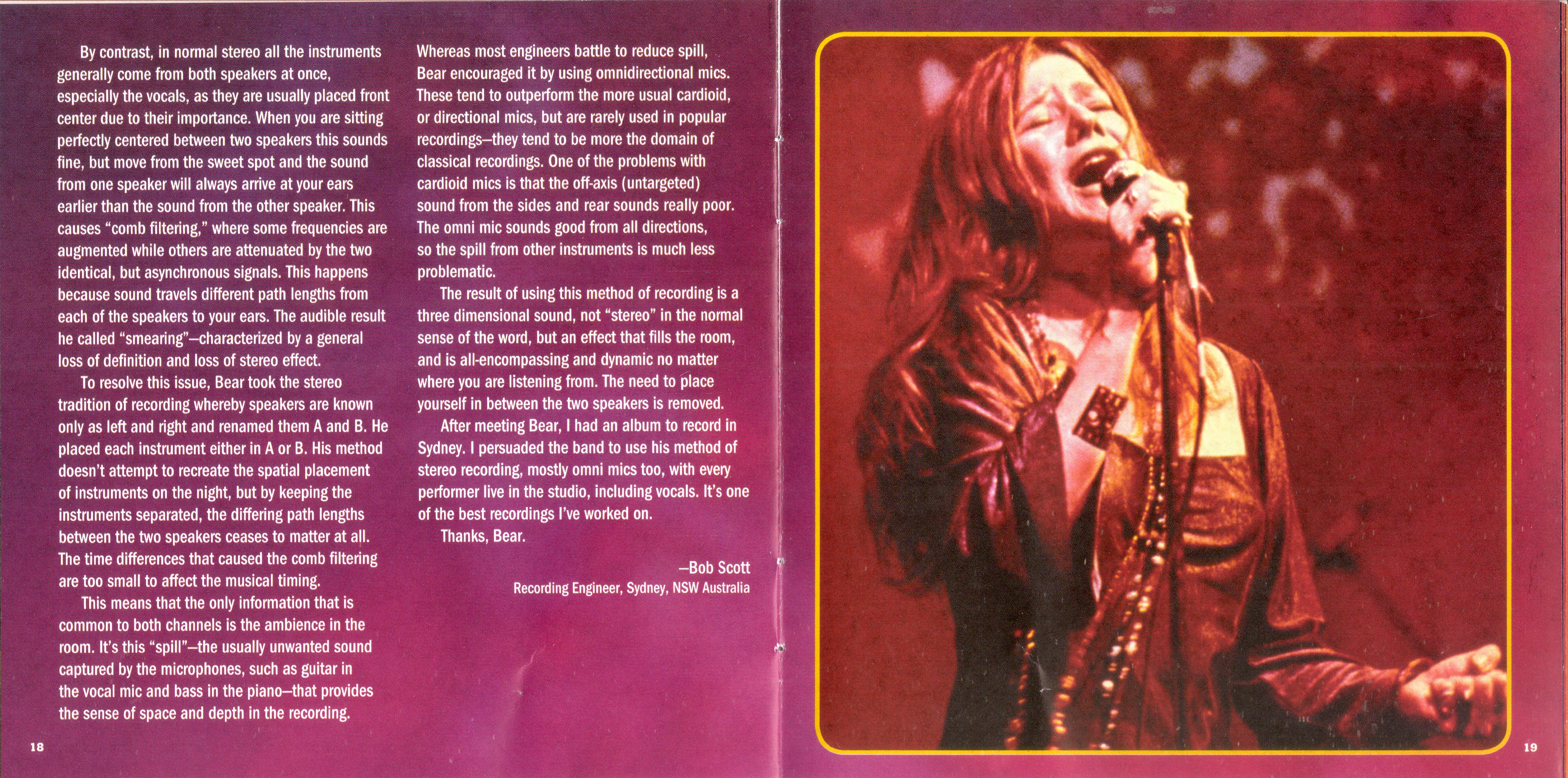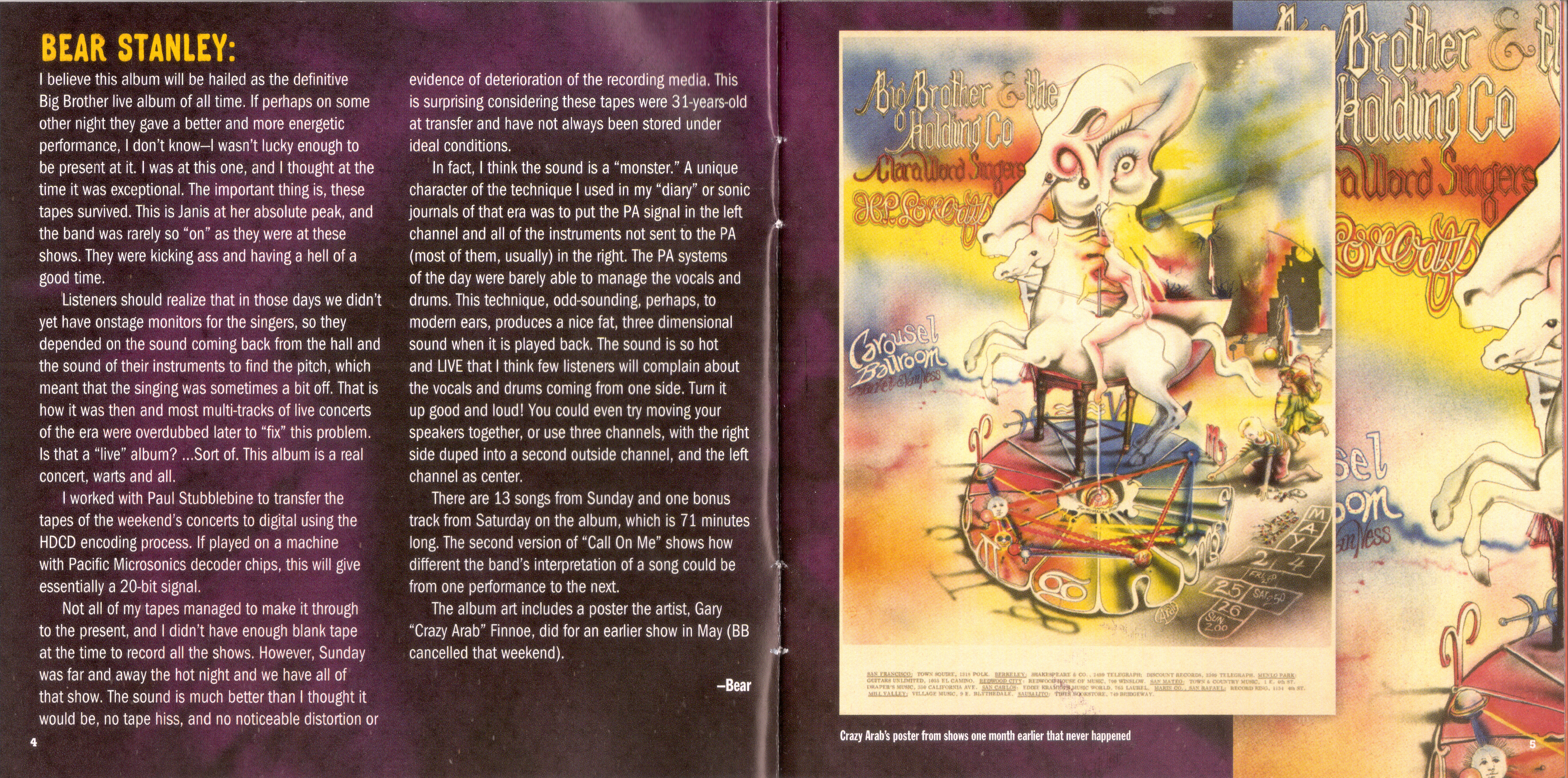 "Care was taken to preserve and ensure the integrity of the music as well as to present an accurate snapshot of the masterful talent of one of the greatest singers of her generation and one of the hottest live bands in the San Francisco scene," wrote Bear's widow, Sheilah Stanley, in her dedication to Live at the Carousel Ballroom 1968. "This is Bear's vision - how he heard the band live, and how he wanted to transmit that to you...this truly is Bear's presentation of this phenomenal band and inspirational music."