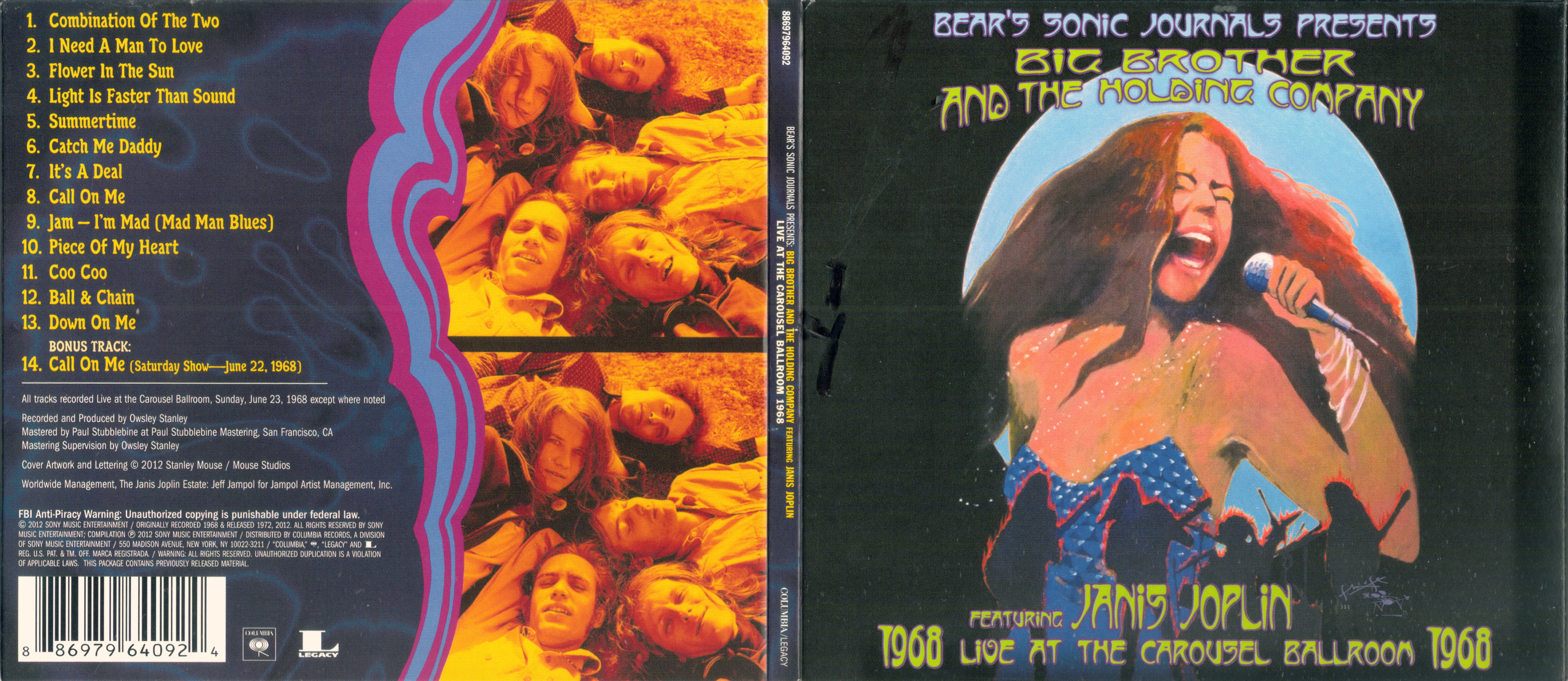Columbia/Legacy Recordings is proud to announce the release of Live at the Carousel Ballroom 1968, a previously unavailable live concert recording of Big Brother and the Holding Company featuring Janis Joplin, recorded June 23, 1968 by legendary soundman Owsley Stanley, a/k/a "Bear," who supervised the mastering of this release before his fatal car accident on March 12, 2011, in his adopted homeland of Australia. The release of the album marks the one-year anniversary of his passing and is dedicated to Bear.