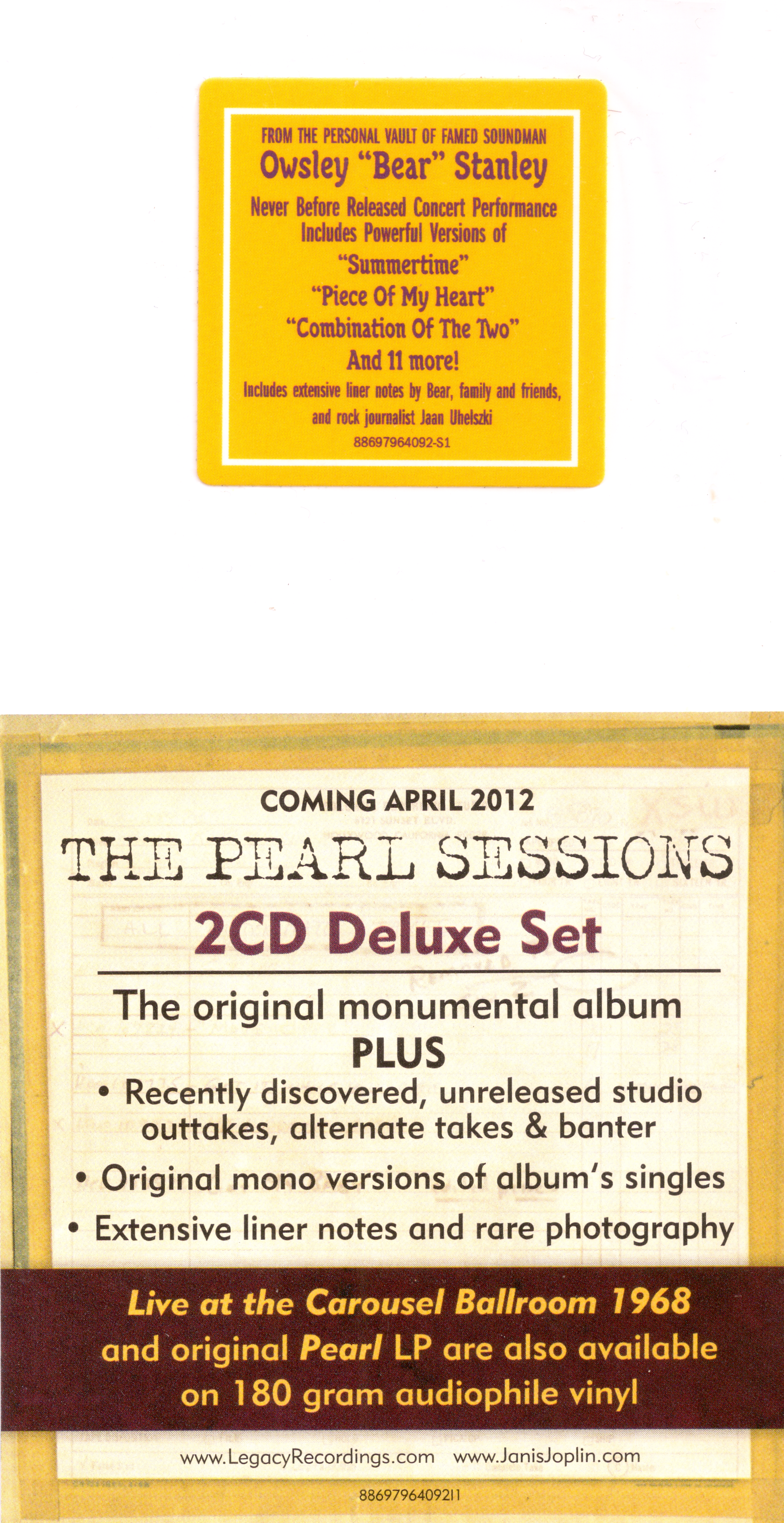 A limited edition double 10" high fidelity vinyl gatefold release, Highlights from The Pearl Sessions will be available exclusively for Record Store Day (April 21, 2012). A companion to the newly curated two CD edition of Joplin's farewell masterpiece, Pearl, this vinyl release presents previously unreleased and seldom heard takes and early versions of classic songs, culled from the recently discovered tapes used to create The Pearl Sessions.