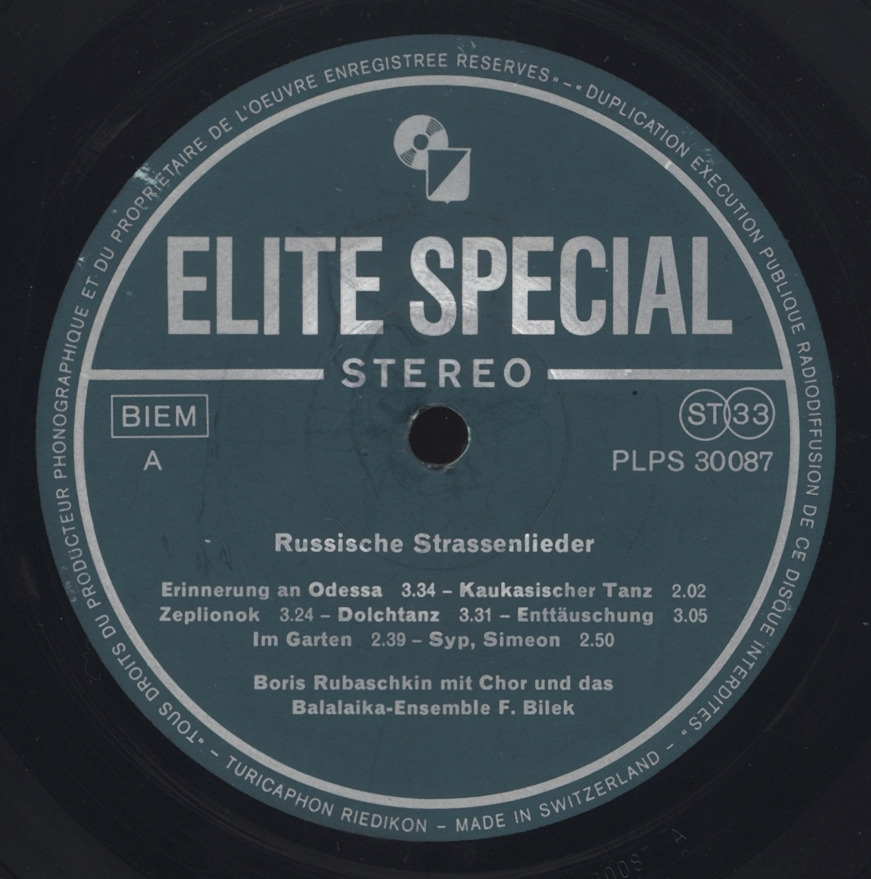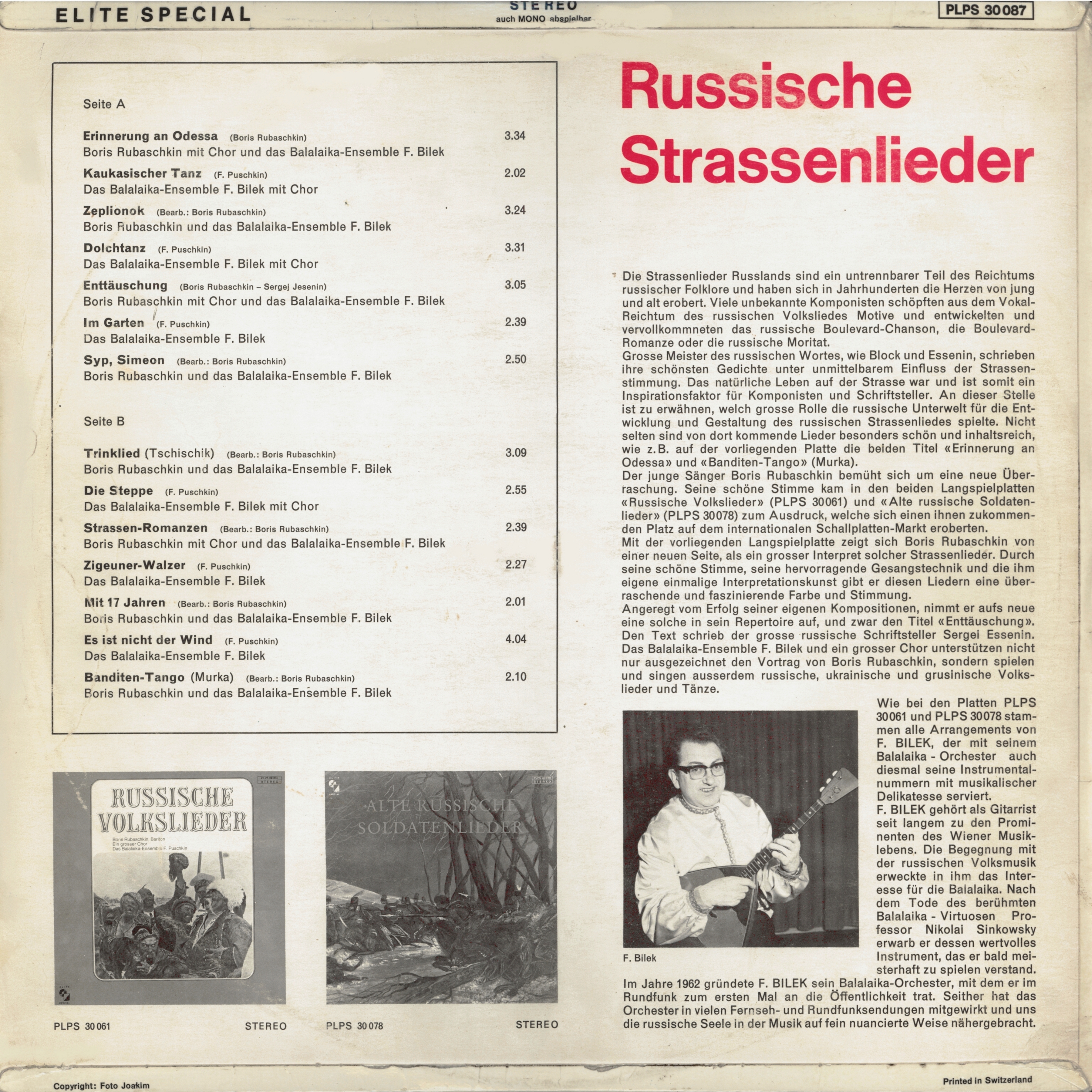 Wie bei den Platten PLPS 30061 und PLPS 30078 stammen alle Arrangements von F. BILEK, der mit seinem Balalaika - Orchester auch diesmal seine Instrumentalnummern mit musikalischer Delikatesse serviert.