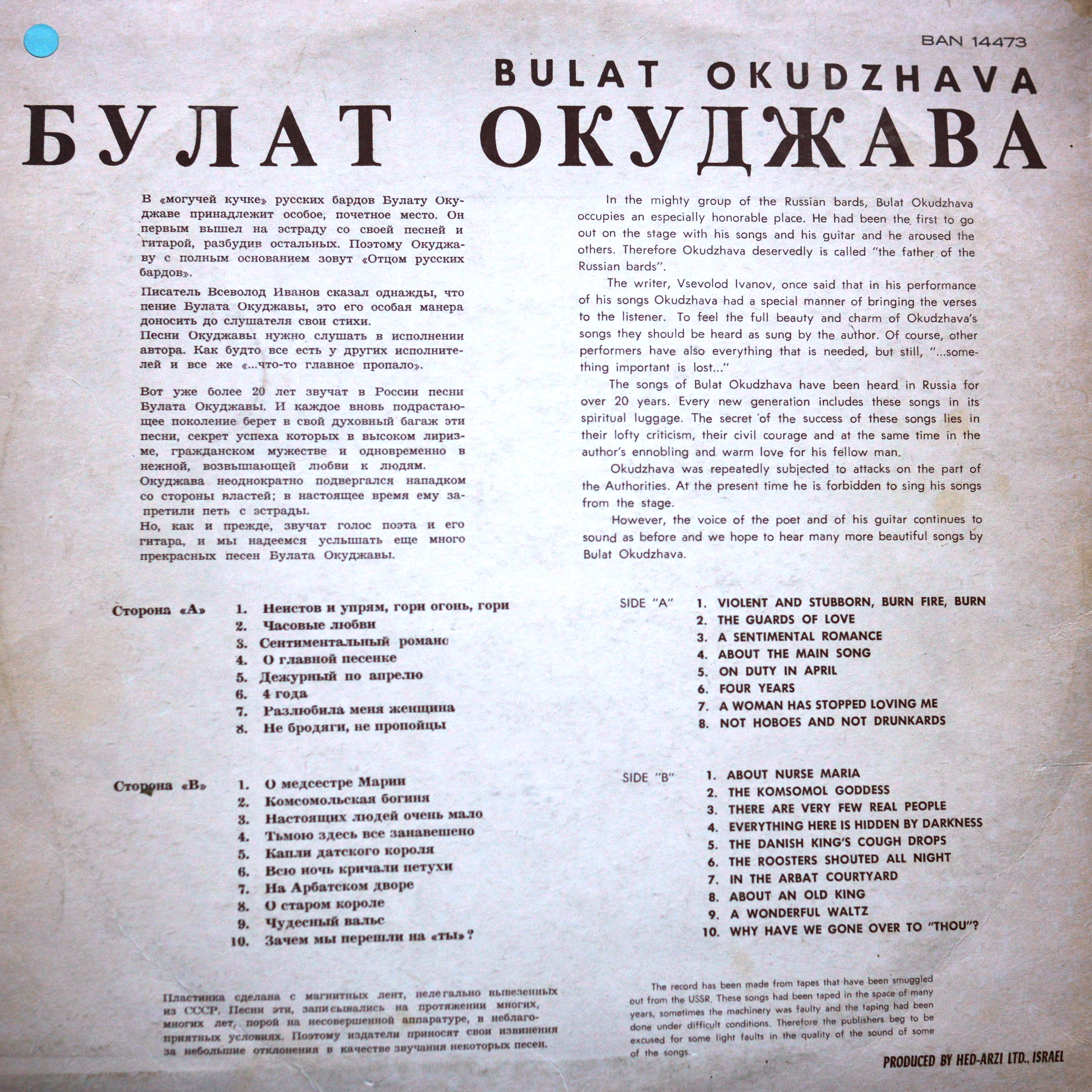 Пластинка сделана с магнитных лент, нелегально вывезенных из СССР. Песни эти, записывались на протяжении многих, многих лет, порой на не совершенной аппаратуре, в неблаго приятных условиях. Поэтому издатели приносят свои извинения за небольшие отклонения в качестве звучания некоторых песен.