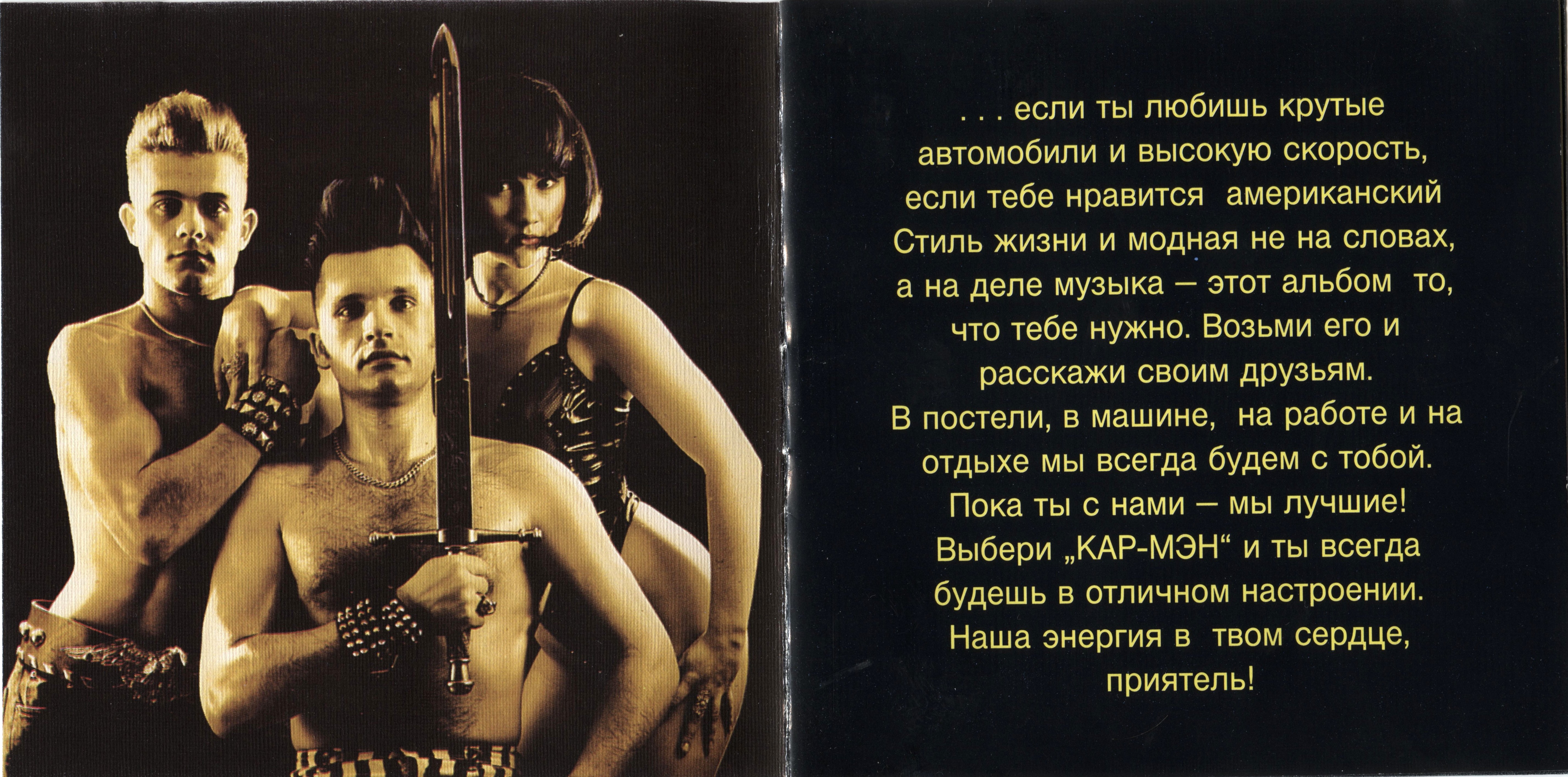 ...Если ты любишь крутые автомобили и высокую скорость, если тебе нравится американский стиль жизни и модная не на словах, а на деле музыка - этот альбом то, что тебе нужно. Возьми его и расскажи своим друзьям. В постели, в машине, на работе и на отдыхе мы всегда будем с тобой. Пока ты с нами - мы лучшие! Выбери "КАР-МЭН" и ты всегда будешь в отличном настроении. Наша энергия в твоём сердце, приятель!