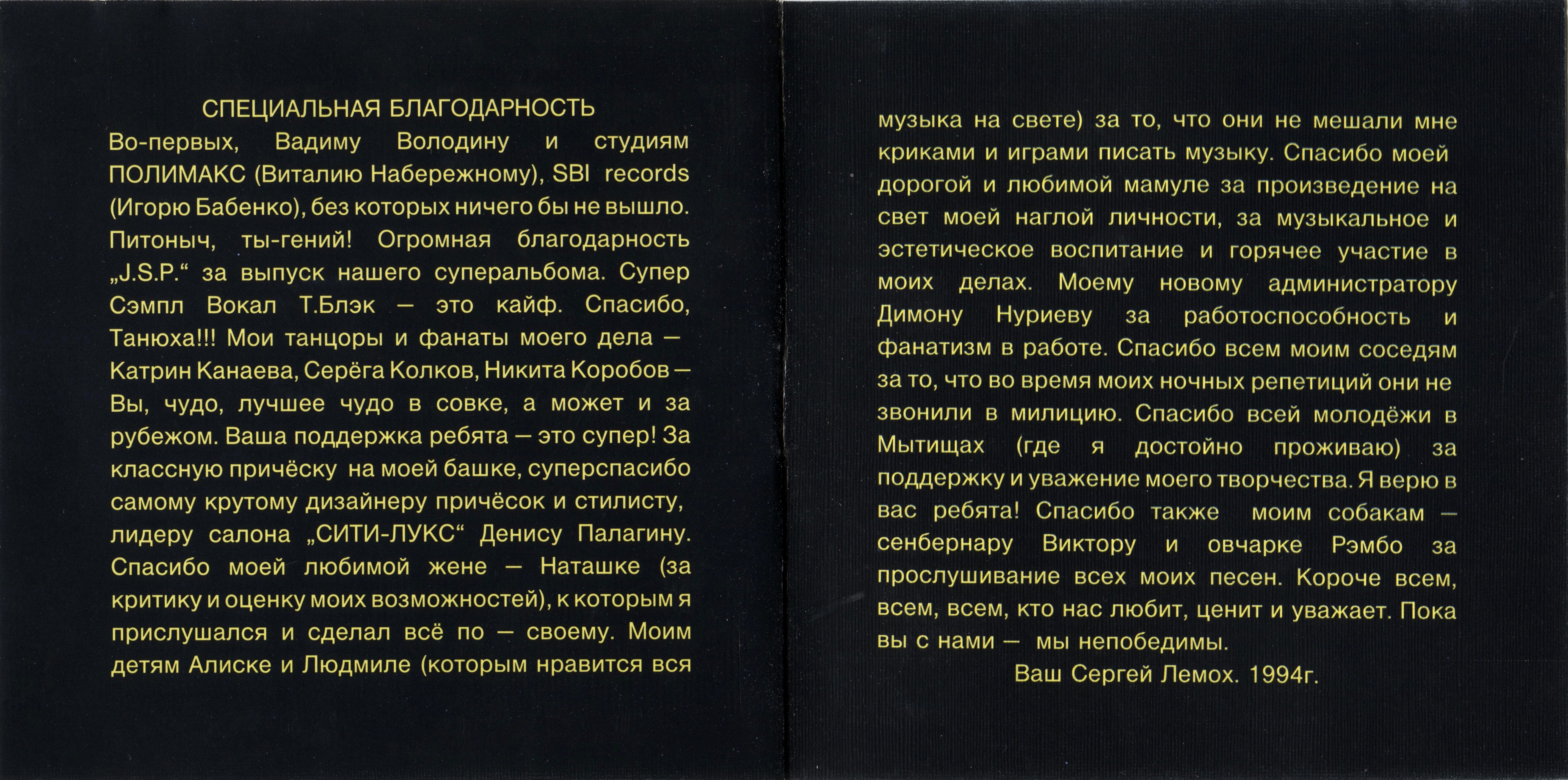 Во-первых, Вадиму Володину И студиям ПОЛИМАКС (Виталию Набережному), SBI records (Игорю Бабенко), без которых ничего бы не вышло. Питоныч, ты-гений! Огромная благодарность „J.S.P.“ за выпуск нашего суперальбома. Супер Сэмпл Вокал Т.Блэк это кайф. Спасибо, Танюха!!! Мои танцоры и фанаты моего дела — Катрин Канаева, Серёга Колков, Никита Коробов — Вы, чудо, лучшее чудо в совке, а может и за рубежом. Ваша поддержка ребята - это супер! За классную причёску на моей башке, суперспасибо самому крутому дизайнеру причёсок и стилисту, лидеру салона „СИТИ-ЛУКС“ Денису Палагину. Спасибо моей любимой жене Наташке (за критику и оценку моих возможностей), к которым я прислушался и сделал всё по своему. Моим Детям Алиске и Людмиле (которым нравится вся музыка на свете) за то, что они не мешали мне криками и играми писать музыку. Спасибо моей дорогой и любимой мамуле за произведение на свет моей наглой личности, за музыкальное и эстетическое воспитание и горячее участие в моих делах. Моему новому администратору Димону Нуриеву за работоспособность И фанатизм в работе. Спасибо всем моим соседям за то, что во время моих ночных репетиций они не звонили в милицию. Спасибо всей молодёжи в Мытищах (где я достойно проживаю) за поддержку и уважение моего творчества. Я верю в вас ребята! Спасибо также моим собакам сенбернару Виктору и овчарке Рэмбо за прослушивание всех моих песен. Короче всем, всем, всем, кто нас любит, ценит и уважает. Пока вы с нами - мы непобедимы.