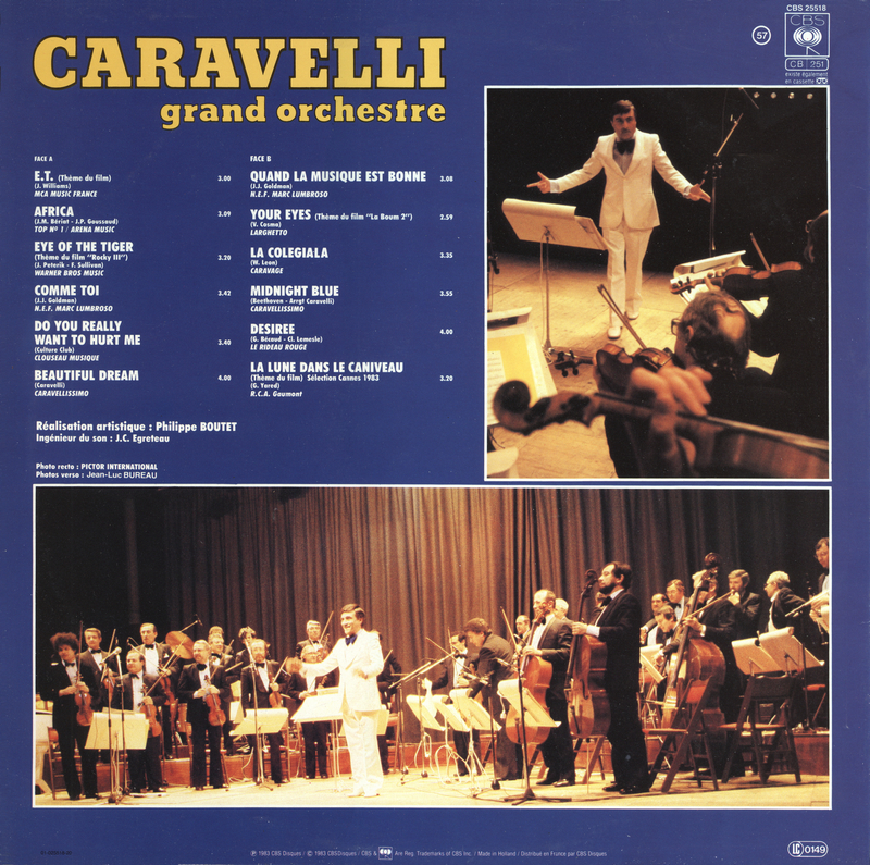 есть такой вопрос.У Каравелли примерно в то же время выходил альбом каравелли в Москве.Это по моему единственный пример,когда западный музыкант делает свои версии на советскую музыку.Ведь сколько оркестров было западных и они совершенно игнорировали советские мелодии.Ну может Франсис Гойя исполнял мелодии Пахмутовой,да и то по моему альбом был записан у нас и на западе не выходил.Еще Рей Коннифф в Москве.Но там в основном не столько советские,сколько русские дореволюционные мелодии.С Каравелли наверное такая же ситуация.Запись сделана в Москве с нашим оркестром и в той же Франции она не появлялась.один раз попалась обложка но сам альбом не разу не попадался