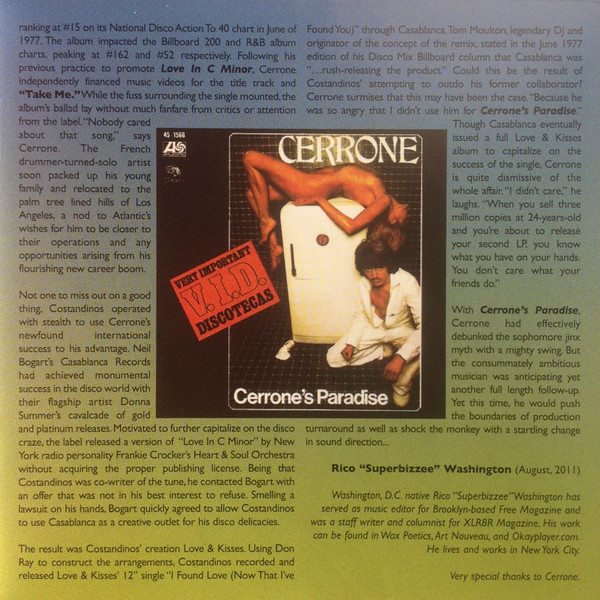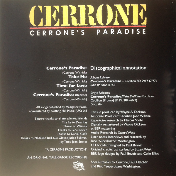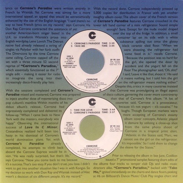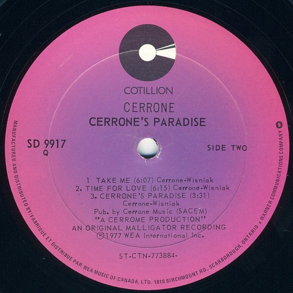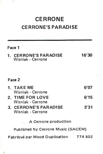 «Cerrone’s Paradise» - второй по счету дискотечный звуковой опус франко-итальянского барабанщика и продюсера Жан-Марка Черроне. Упоминание об этой пластинке всплывало ранее в истории о диско-проекте продюсера Лео Каррье «Paradise», который он создал для своей супруги Тиффани Берой.