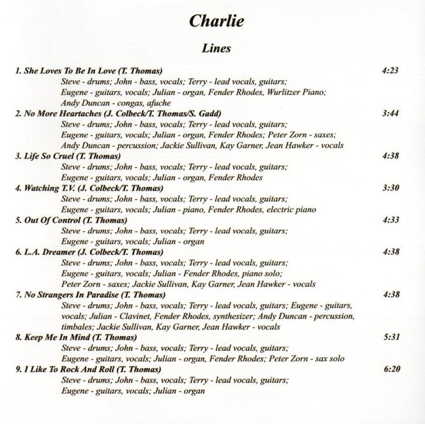 После релиза подал в отставку Смит, а вместо него в составе появился клавишник Джулиан Колбек. В 1977-м вышел второй лонгплей, с которым "Charlie" впервые засветились в американских чартах (85-е место). В том же году к команде присоединился гитарист Юджин Огэн. Он дебютировал на диске "Lines", сопровождавшемся хит-синглом "She Loves To Be In Love". Численность состава продолжала расти и в 1978-м увеличилась еще на одну единицу: вторым ударником стал Шеп Лонсдэйл. Выпуск четвертой пластинки принес "Charlie" неплохие отзывы в прессе и контракт с американской "Arista Records". Как ни странно, но заключение этой сделки поставило команду в тупик.