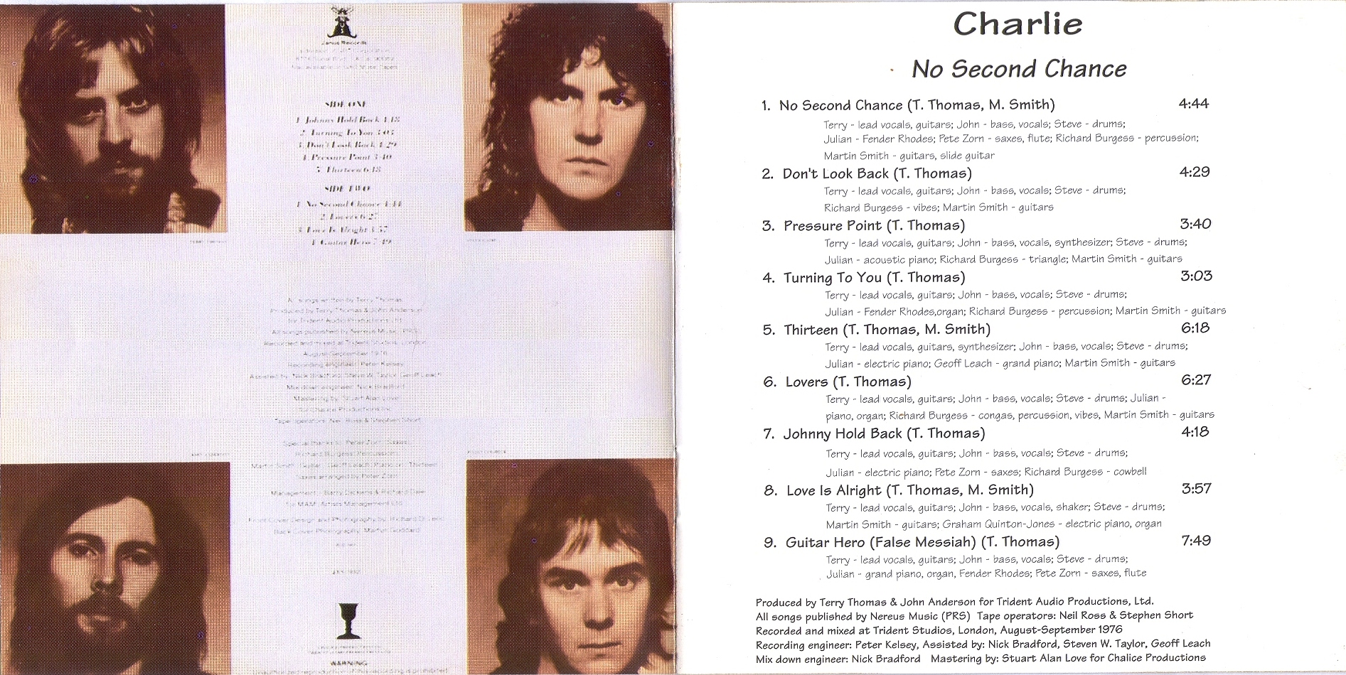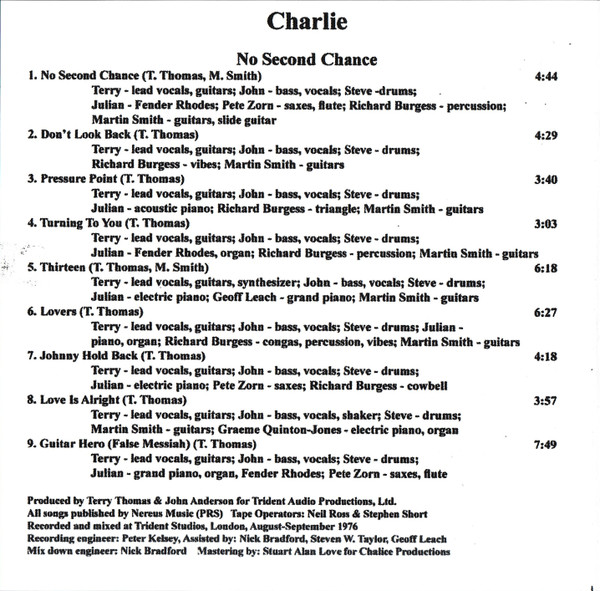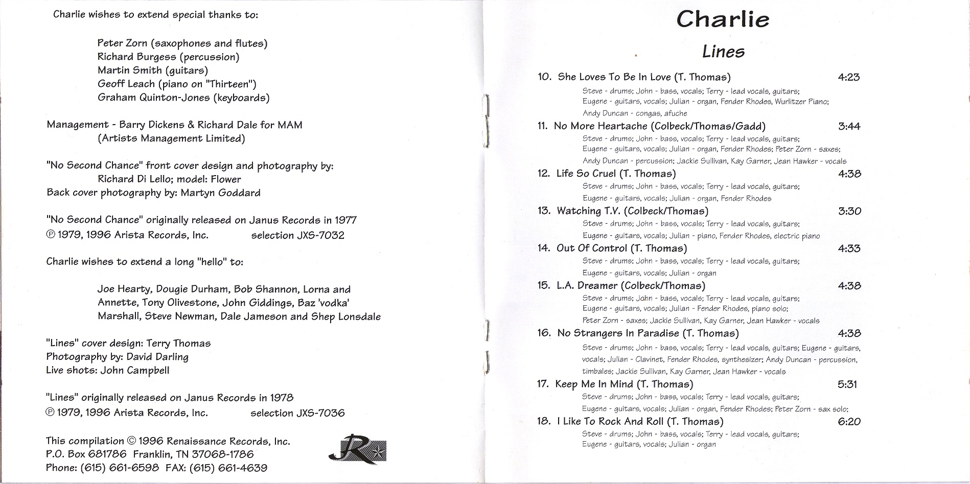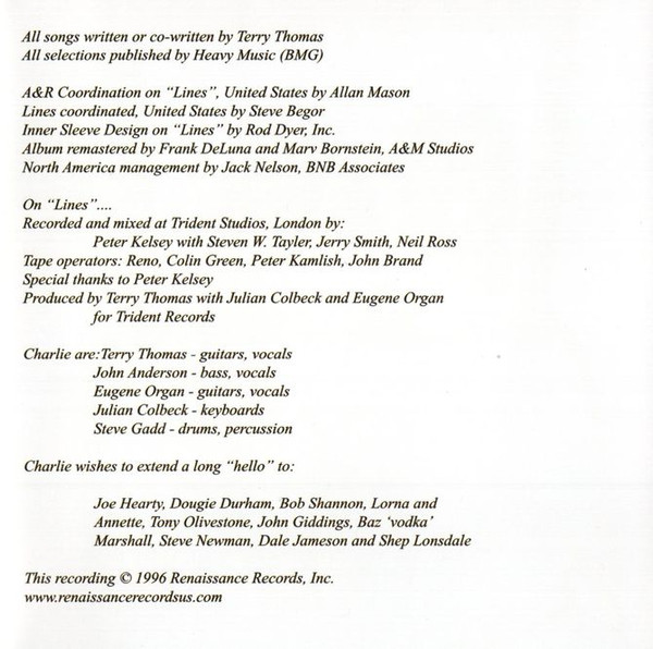 Проект вскоре распался, однако за "Charlie" оставался должок, и Томас исполнил контрактные обязательства, записав с помощью сессионных музыкантов альбом "In Pursuit Of Romance". В 90-х годах начали выходить переиздания группы на CD, но музыкантам не досталось от них ни пенни. Когда же Терри предложил сделать новый альбом "Charlie", ему ответили отказом.