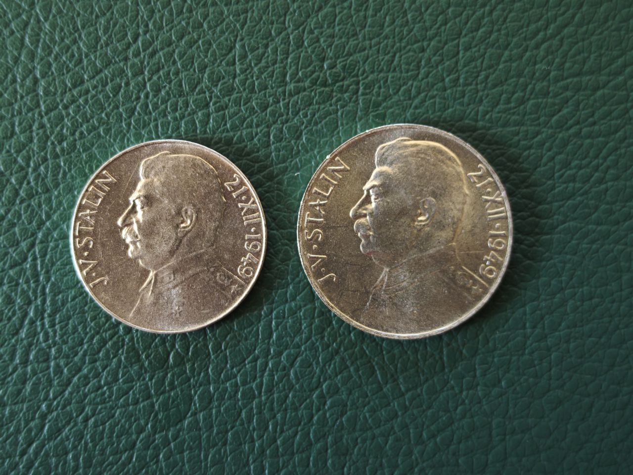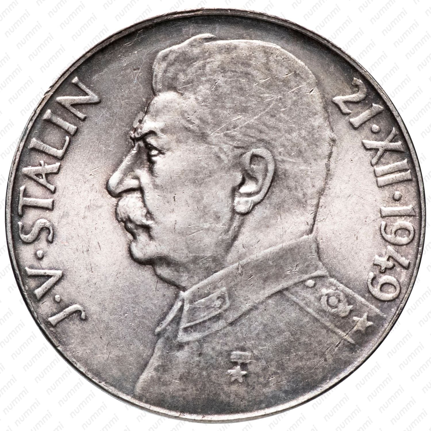 Реверс: в центральной части профильный портрет влево И.В. Сталина. По дуге левого края монеты - его имя на чешском языке: "J.V.STALIN", справа вдоль канта - 70-й день его рождения по официальной версии: "21.XII.1949".
