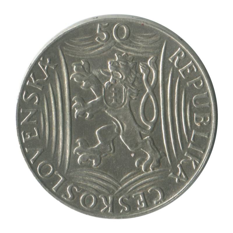 Аверс: в верхней части по дуге края монеты - число: "50", справа, снизу и слева надпись на чешском языке: "REPUBLIKÀ ČESKOSLOVENSKA" - "ЧЕХОСЛОВАЦКАЯ РЕСПУБЛИКА". В центральной части - малый герб Чехословакии: профильное изображение льва с раздвоенным хвостом.