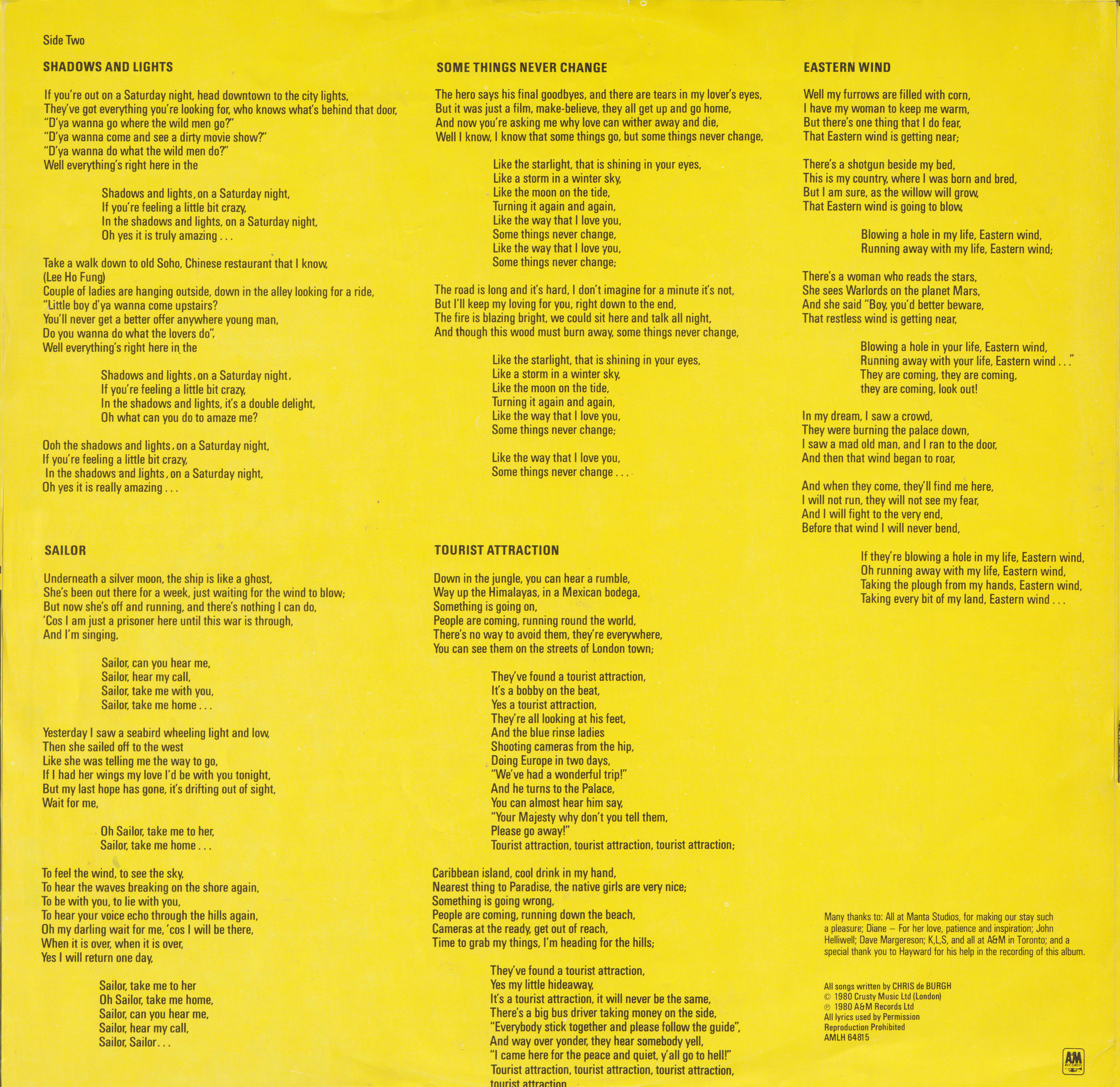 Eastern Wind (Восточный ветер) - пятый студийный альбом певца/автора песен Криса де Бурга, выпущенный в 1980 году. Он не создал британский чарт альбомов или Billboard 200, но достиг № 1 в Норвегии в мае 1981 года и в то время был вторым самым продаваемым альбомом в Норвегии после Abbey Road от The Beatles.