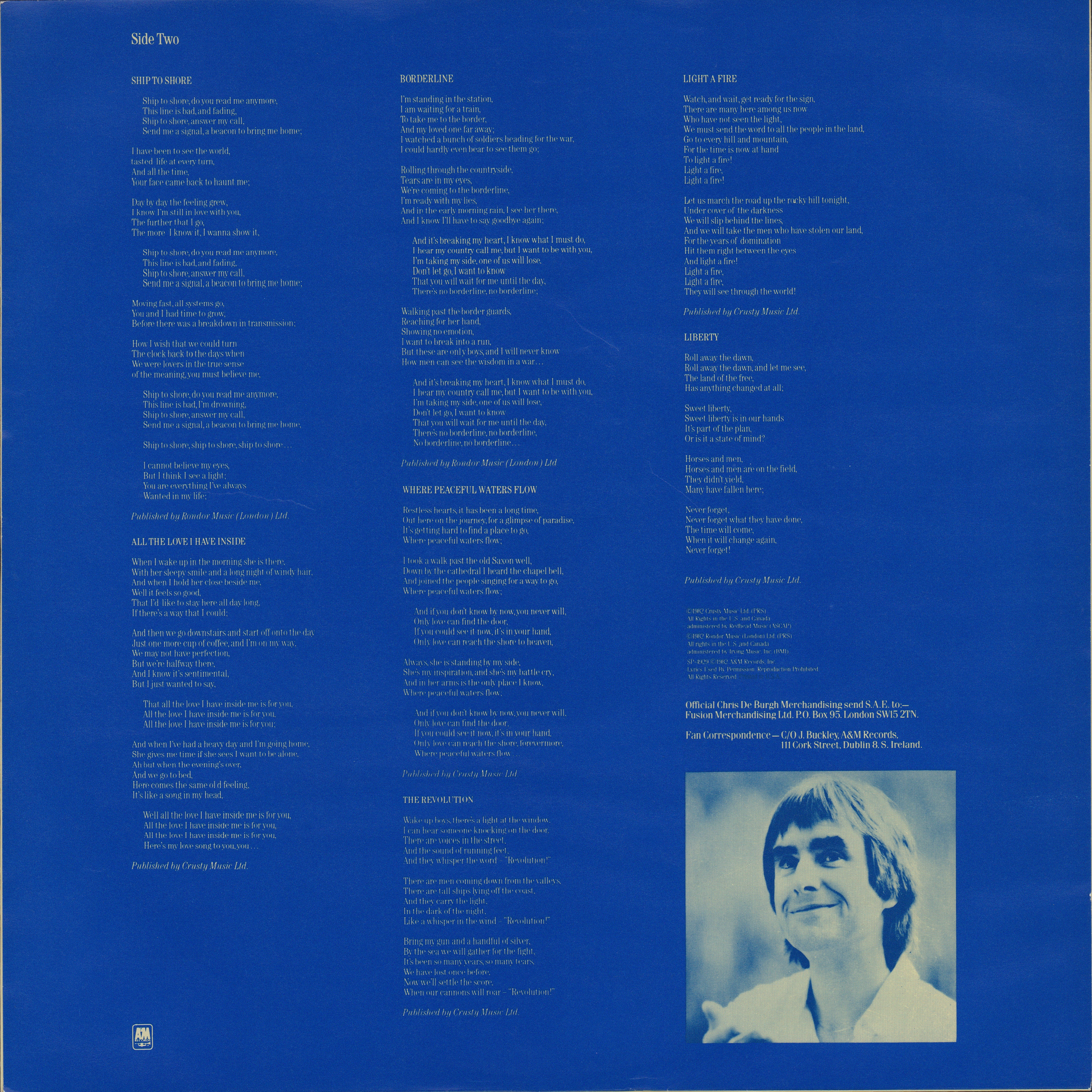 Ещё одна песня из альбома, которая стала фанатом De Burgh, - это «Borderline», история добросовестного возражающего, который решает бежать со своим любовником, чем быть призванным на военную службу. Счастливое действие De Burgh, история песни была продолжена в 1986 году «Say Goodbye to It All» из более позднего альбома в The Light.