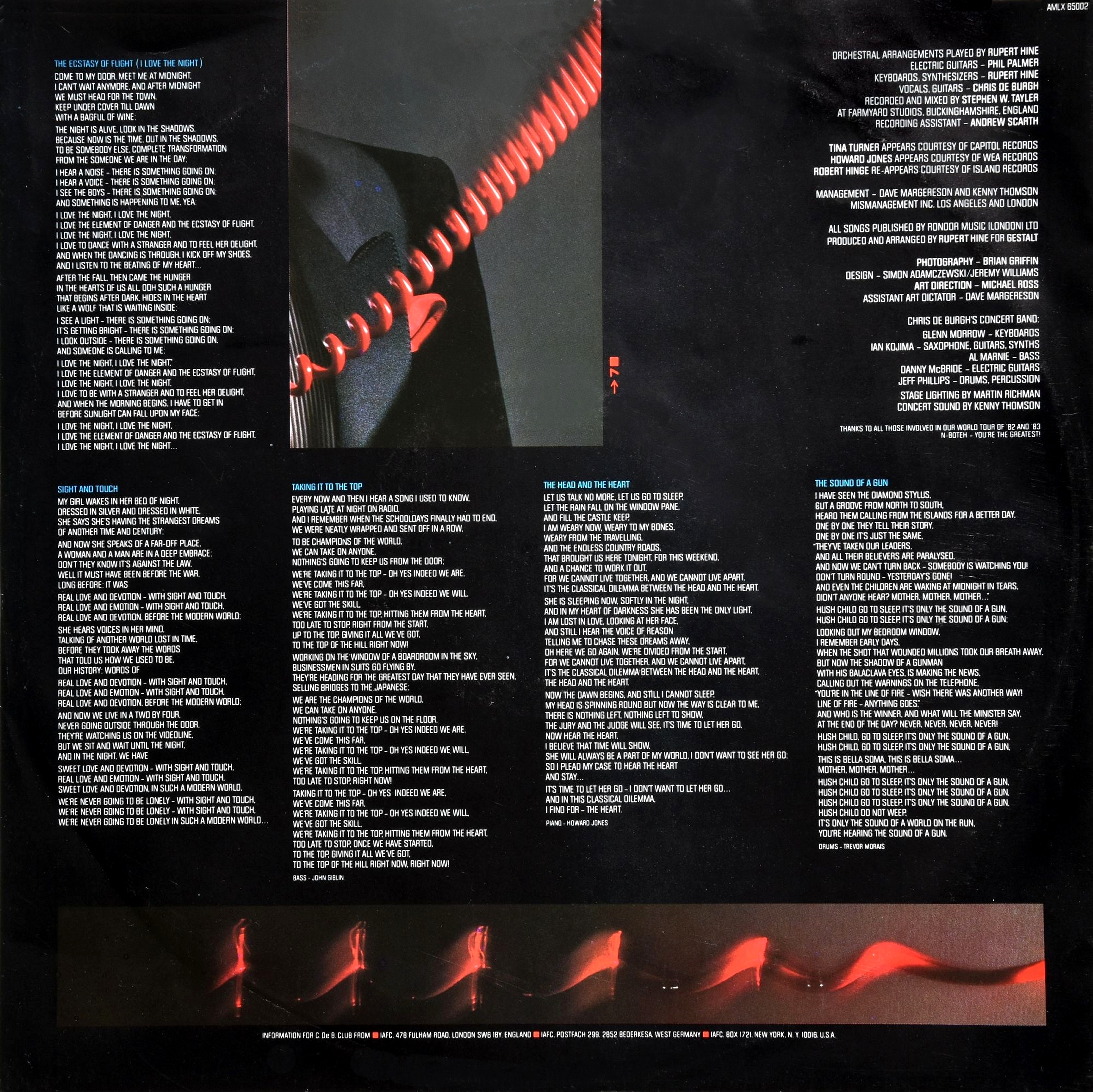 Альбом выпустил второй британский сингл De Burgh «High On Emotion», который вступил в чарту 12 мая 1984 года и достиг мая на 44, в той же позиции, который он оказал на Billboard Hot 100. Последующий сингл «Ecstasy of Flight (Я люблю ночь)», достиг номера 80 в Великобритании.