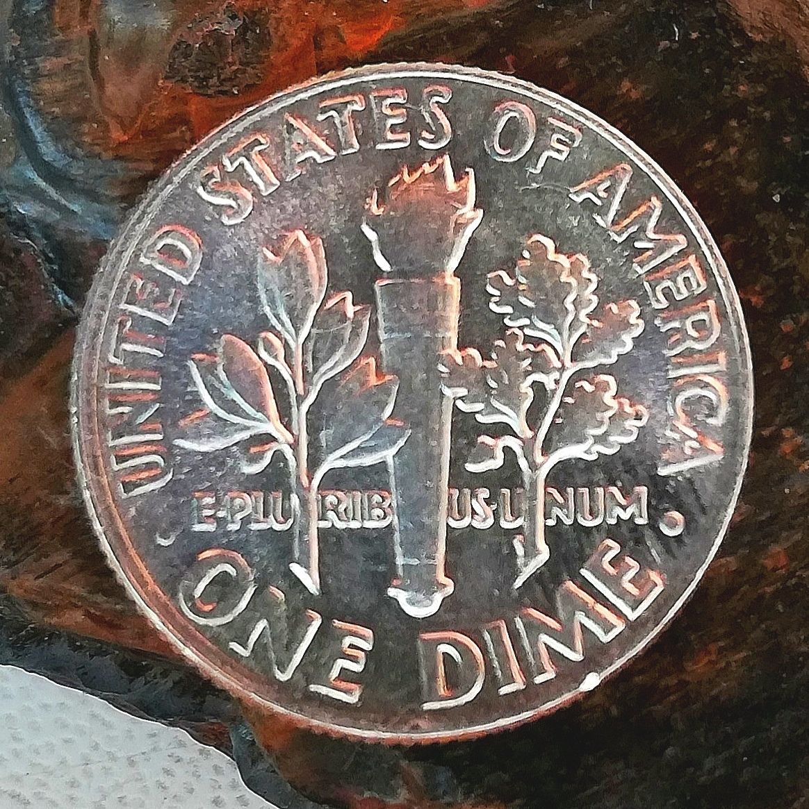 До 1964 года 10 центовые монеты США чеканились из серебра. Представленный экземпляр "последний из могикан" - в следующем году они стали из из меди с никелевым покрытием. Это Roosevelt Dime - в отличие от материала, дизайн монеты неизменен с 1946 года.
